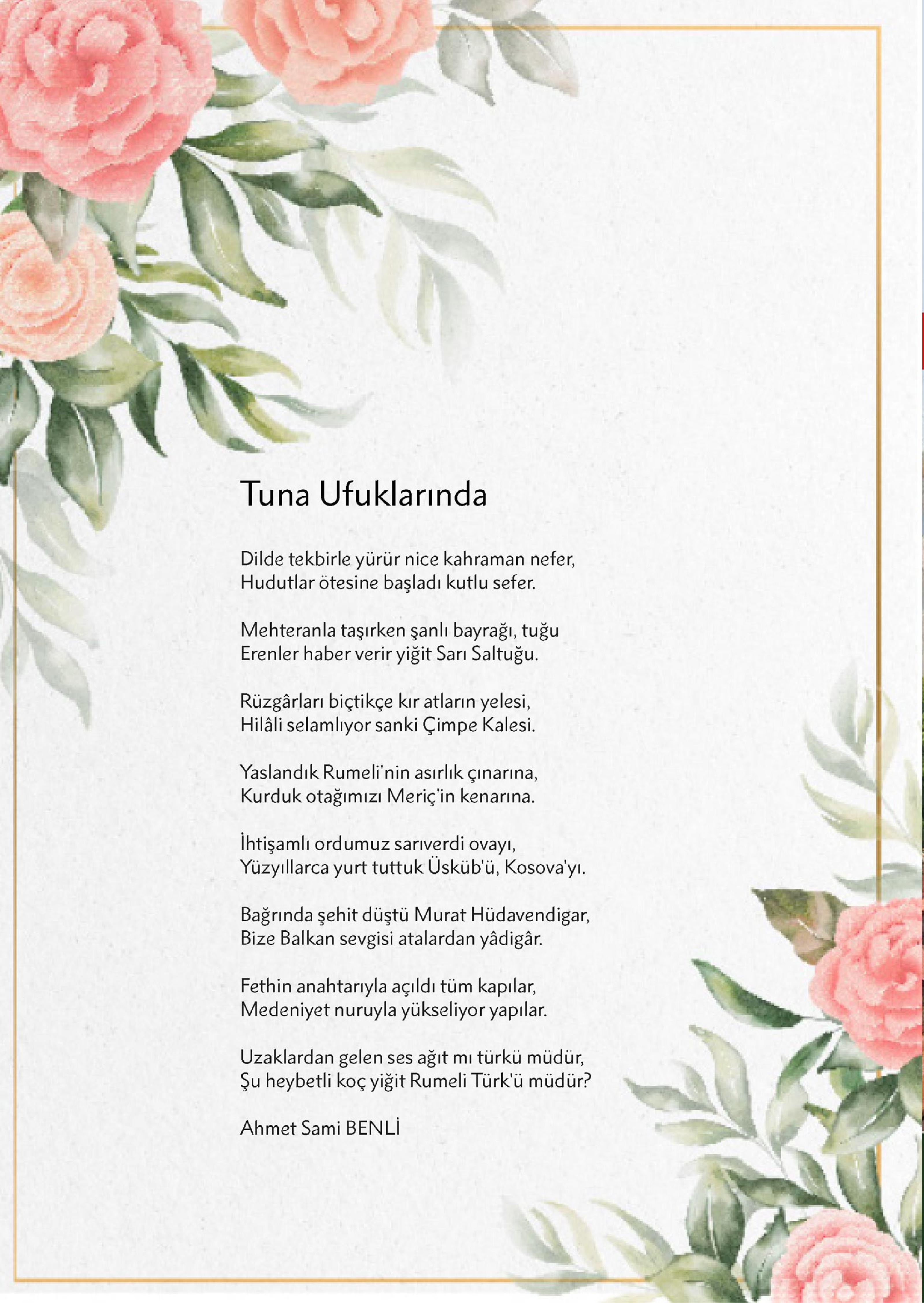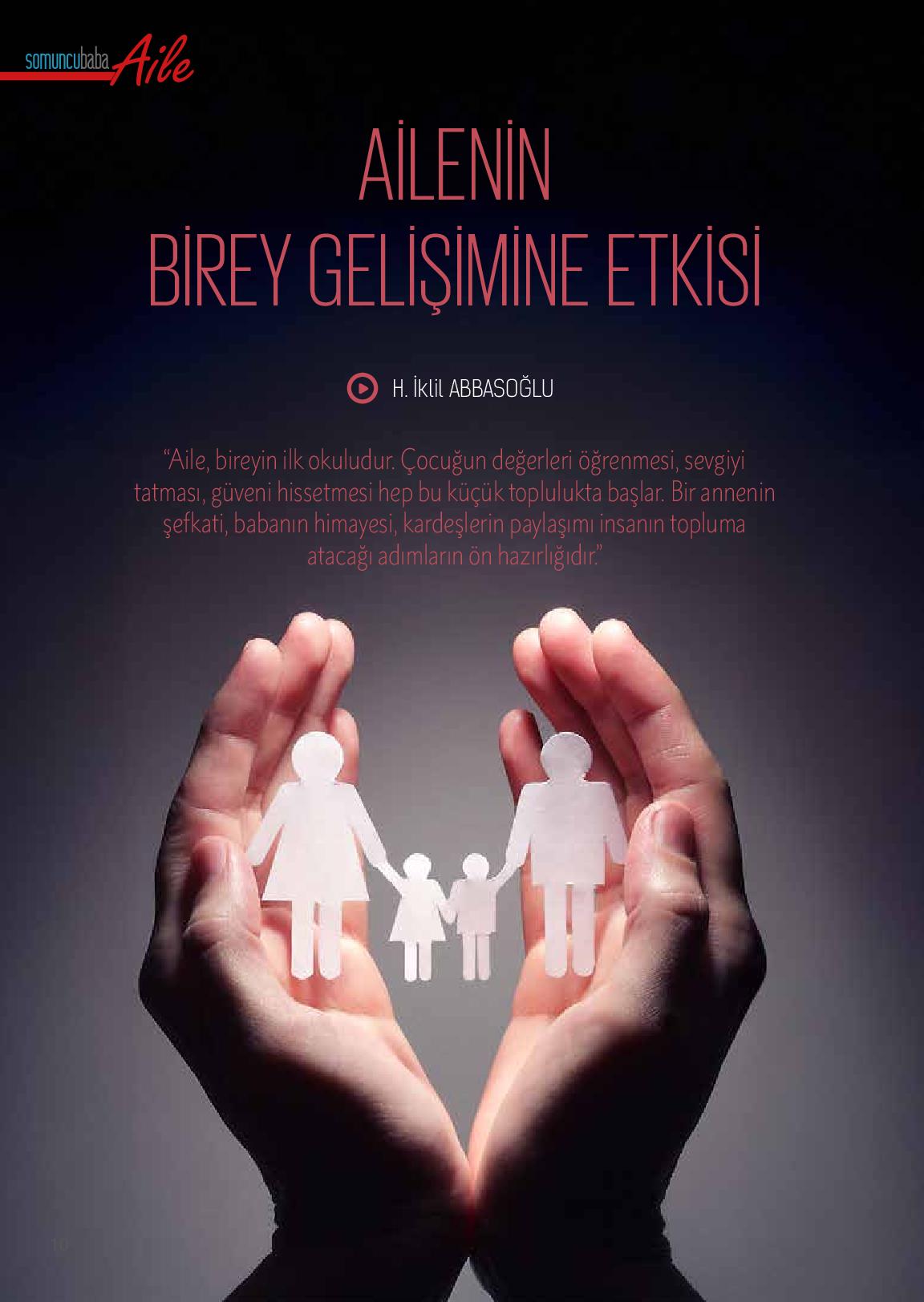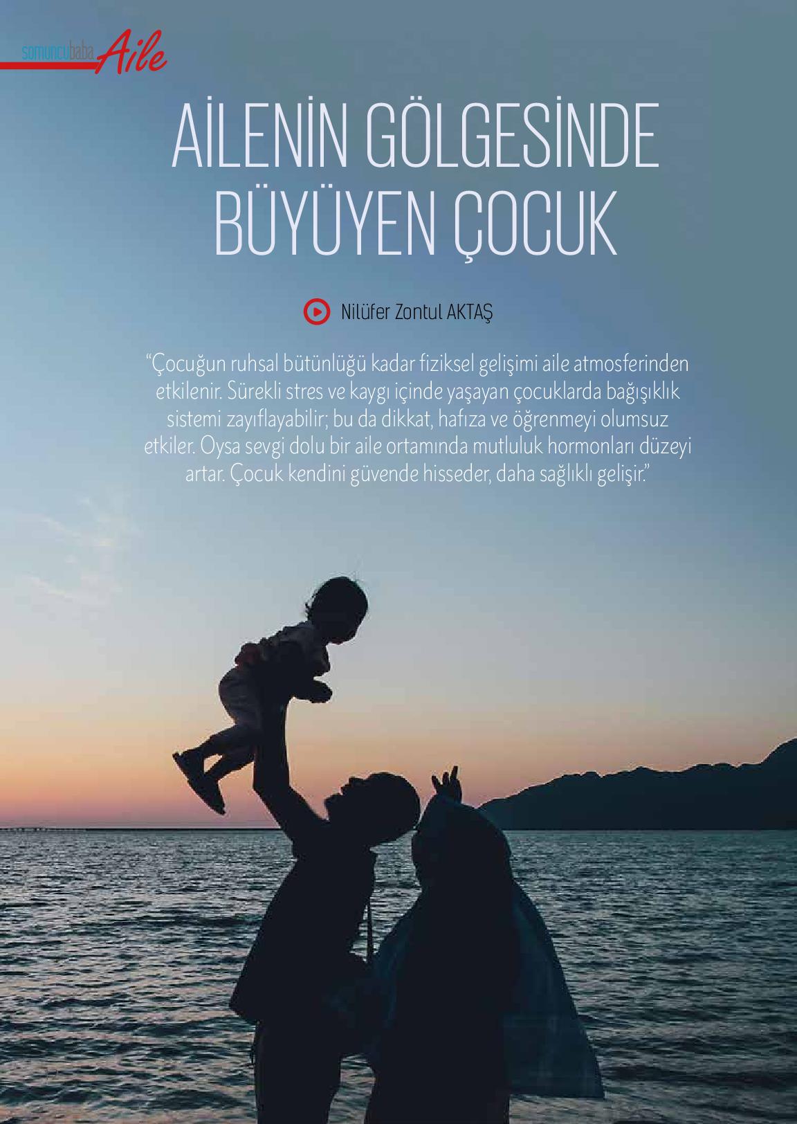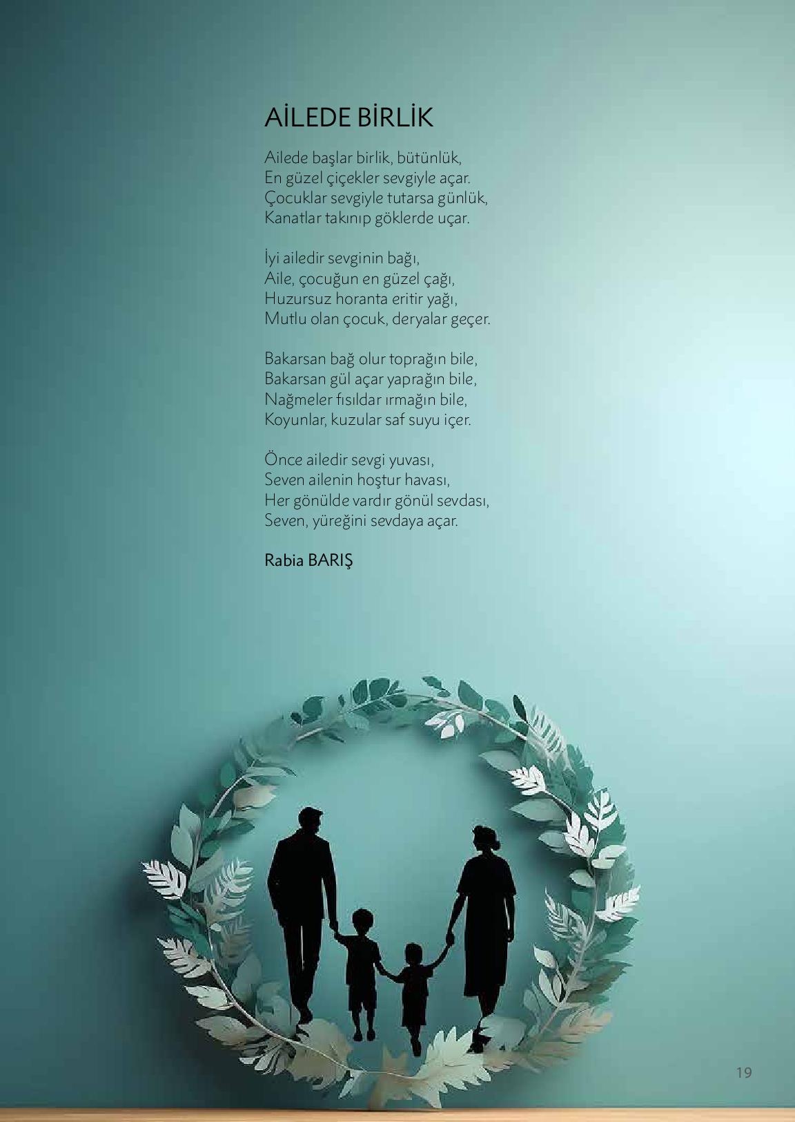 Ailede başlar birlik, bütünlük,En güzel çiçekler sevgiyle açar.Çocuklar sevgiyle tutarsa günlük,Kanatlar takınıp göklerde uçar.İyi ailedir sevginin bağı,Aile, çocuğun en güzel çağı,Huzursuz horanta eritir yağı,Mutlu olan çocuk, deryalar geçer.Bakarsan bağ olur toprağın bile,Bakarsan gül...