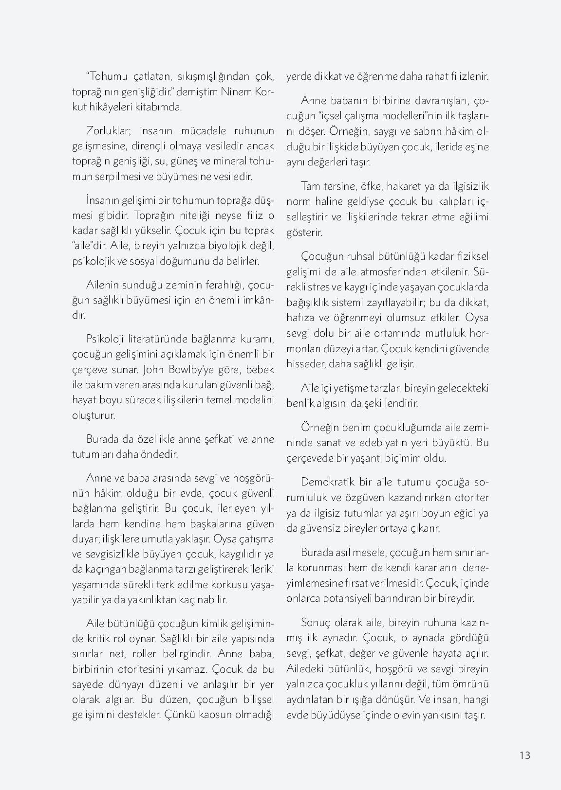 “Tohumu çatlatan, sıkışmışlığından çok, toprağının genişliğidir.” demiştim Ninem Korkut hikâyeleri kitabımda.Zorluklar; insanın mücadele ruhunun gelişmesine, dirençli olmaya vesiledir ancak toprağın genişliği, su, güneş ve mineral tohumun serpilmesi ve büyümesine vesi...