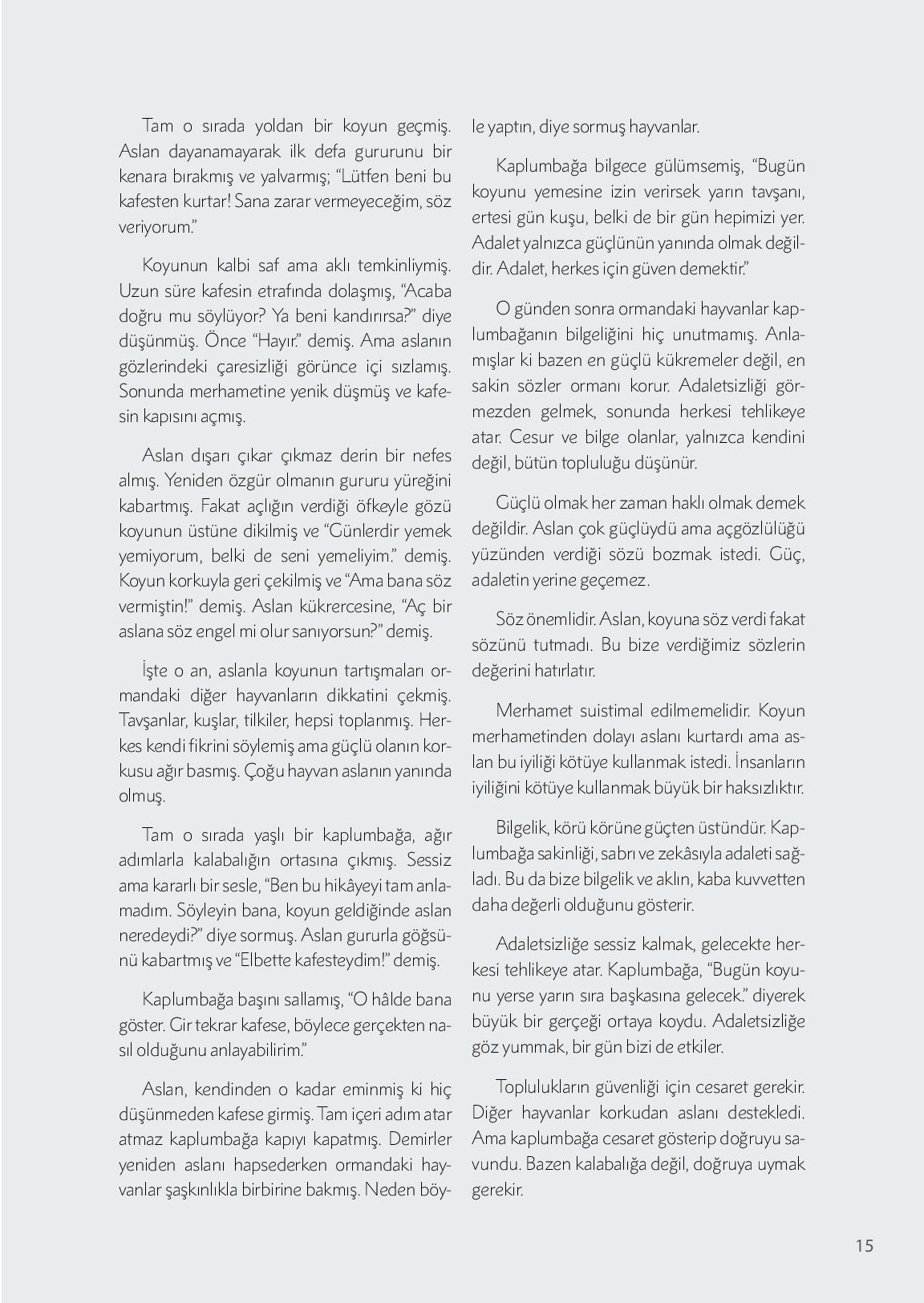 Bir zamanlar, hayvanların barış içinde yaşadığı geniş bir ormanda, kendini dünyanın en güçlü canlısı sanan bir aslan yaşarmış. Onun kükremesiyle ağaçların yaprakları titrer, bütün hayvanlar yolunu değiştirirmiş. Aslan, güçlüymüş ama gururu daha da büyükmüş.Bir gün avcıların kur...