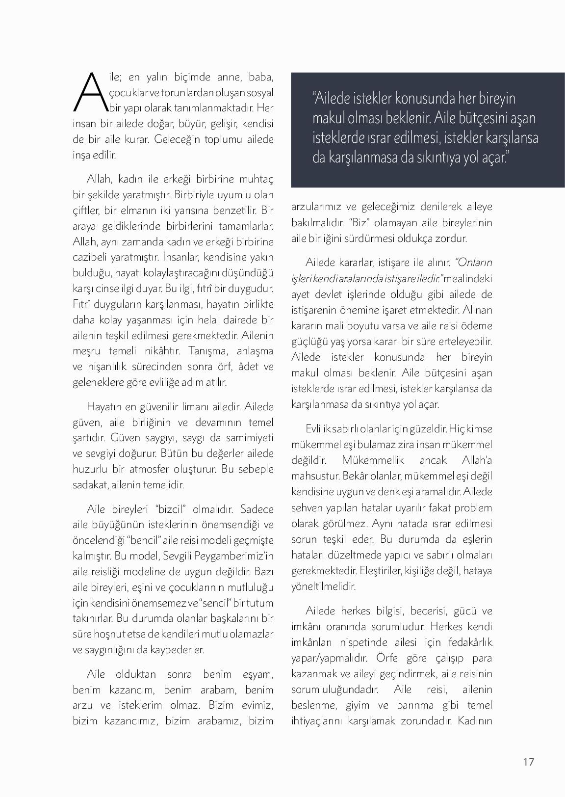 Aile; en yalın biçimde anne, baba, çocuklar ve torunlardan oluşan sosyal bir yapı olarak tanımlanmaktadır. Her insan bir ailede doğar, büyür, gelişir, kendisi de bir aile kurar. Geleceğin toplumu ailede inşa edilir. Allah, kadın ile erkeği birbirine muhtaç bir şek...