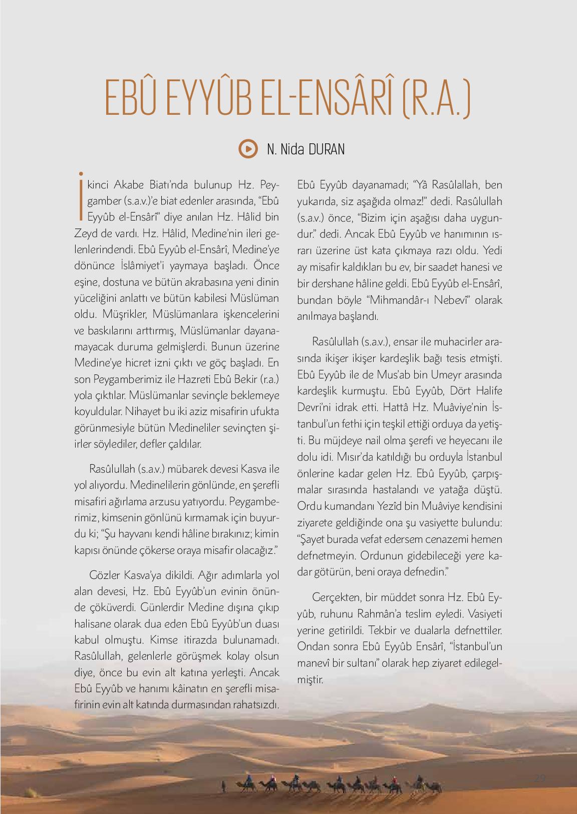 İkinci Akabe Biatı’nda bulunup Hz. Peygamber (s.a.v.)’e biat edenler arasında, “Ebû Eyyûb el-Ensârî” diye anılan Hz. Hâlid bin Zeyd de vardı. Hz. Hâlid, Medine’nin ileri gelenlerindendi. Ebû Eyyûb el-Ensârî, Medine’ye dönünce İslâmiyet’i yaymaya başladı. Önce eşine, dostuna...