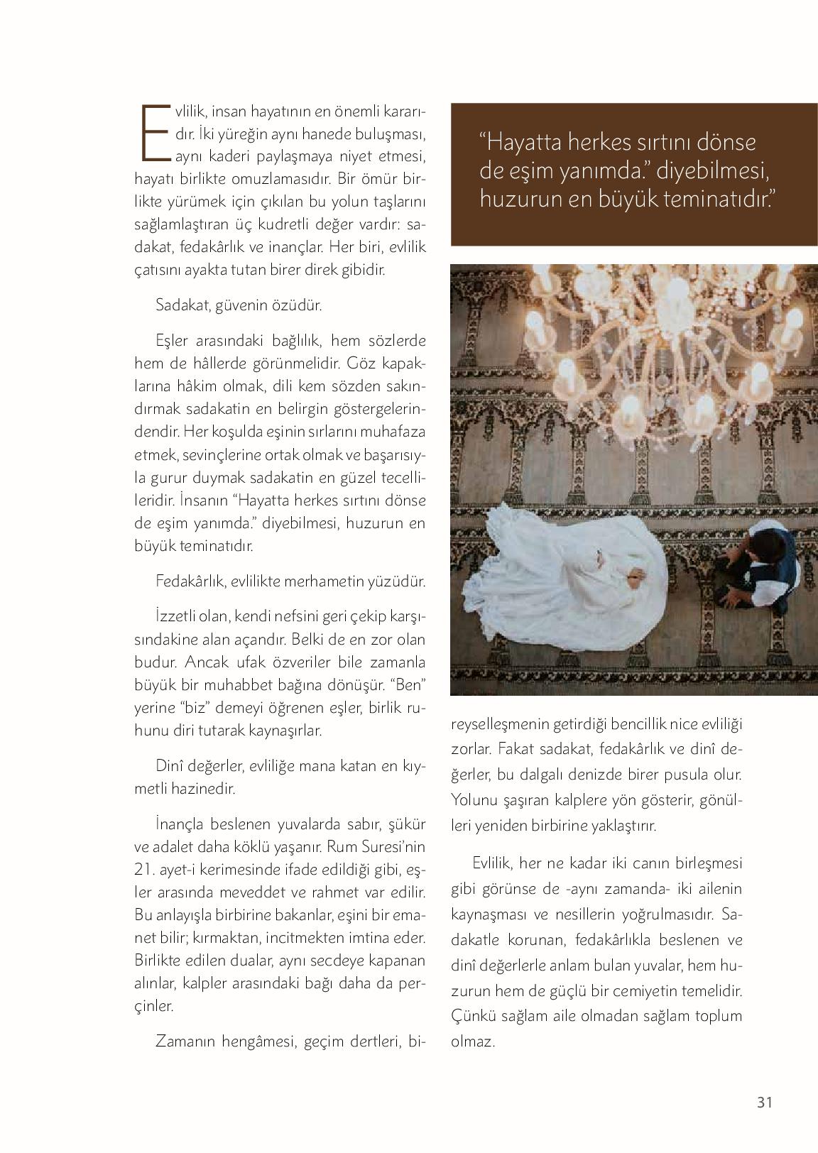 Evlilik, insan hayatının en önemli kararıdır. İki yüreğin aynı hanede buluşması, aynı kaderi paylaşmaya niyet etmesi, hayatı birlikte omuzlamasıdır. Bir ömür birlikte yürümek için çıkılan bu yolun taşlarını sağlamlaştıran üç kudretli değer vardır: sadakat, fe...