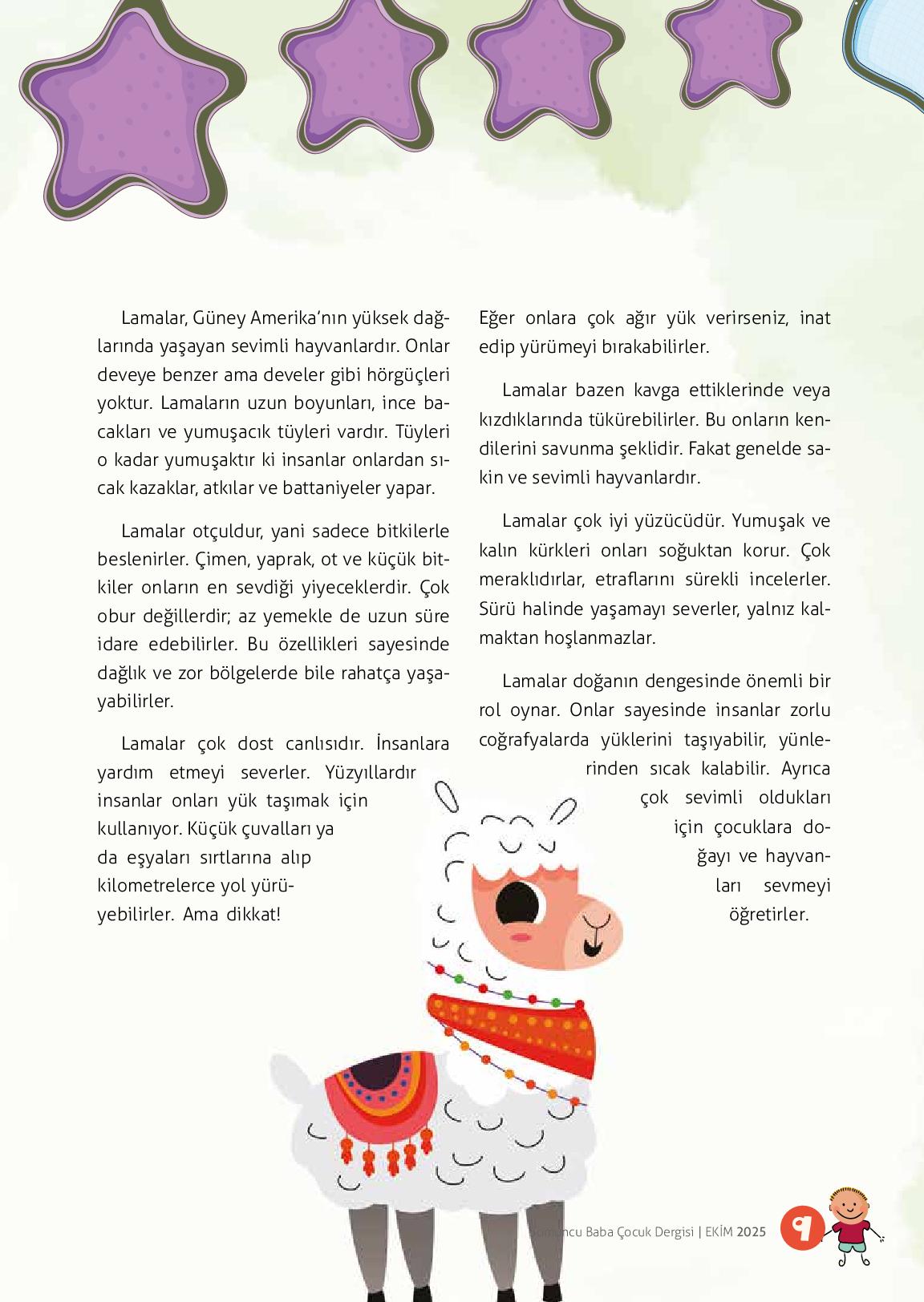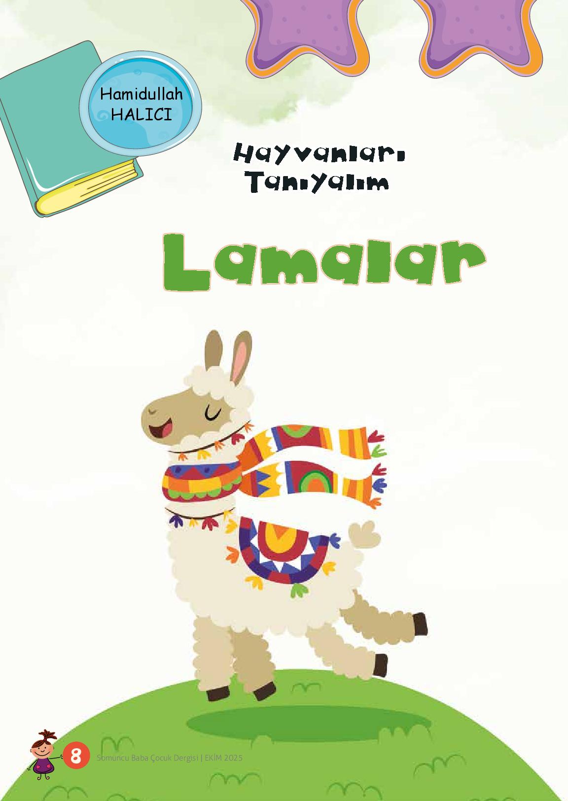 Lamalar, Güney Amerika’nın yüksek dağlarında yaşayan sevimli hayvanlardır. Onlar deveye benzer ama develer gibi hörgüçleri yoktur. Lamaların uzun boyunları, ince bacakları ve yumuşacık tüyleri vardır. Tüyleri o kadar yumuşaktır ki insanlar onlardan sıcak kazaklar, atkılar ve battaniyeler yapa...
