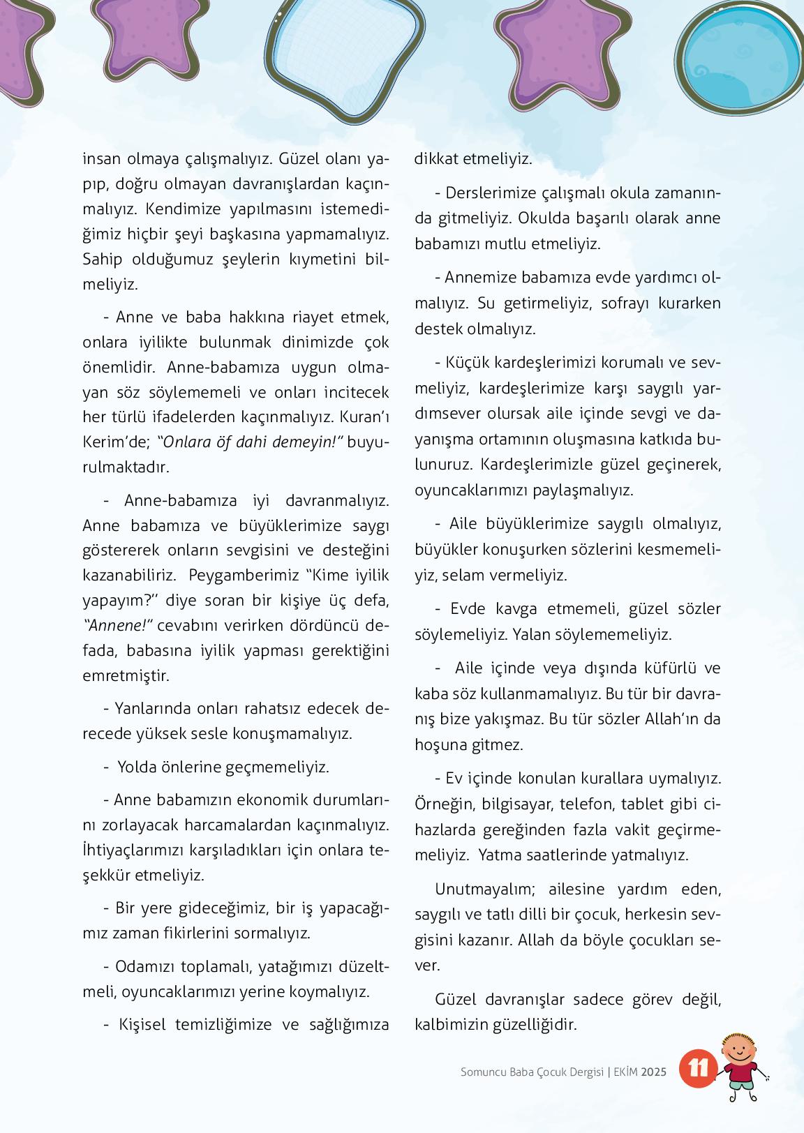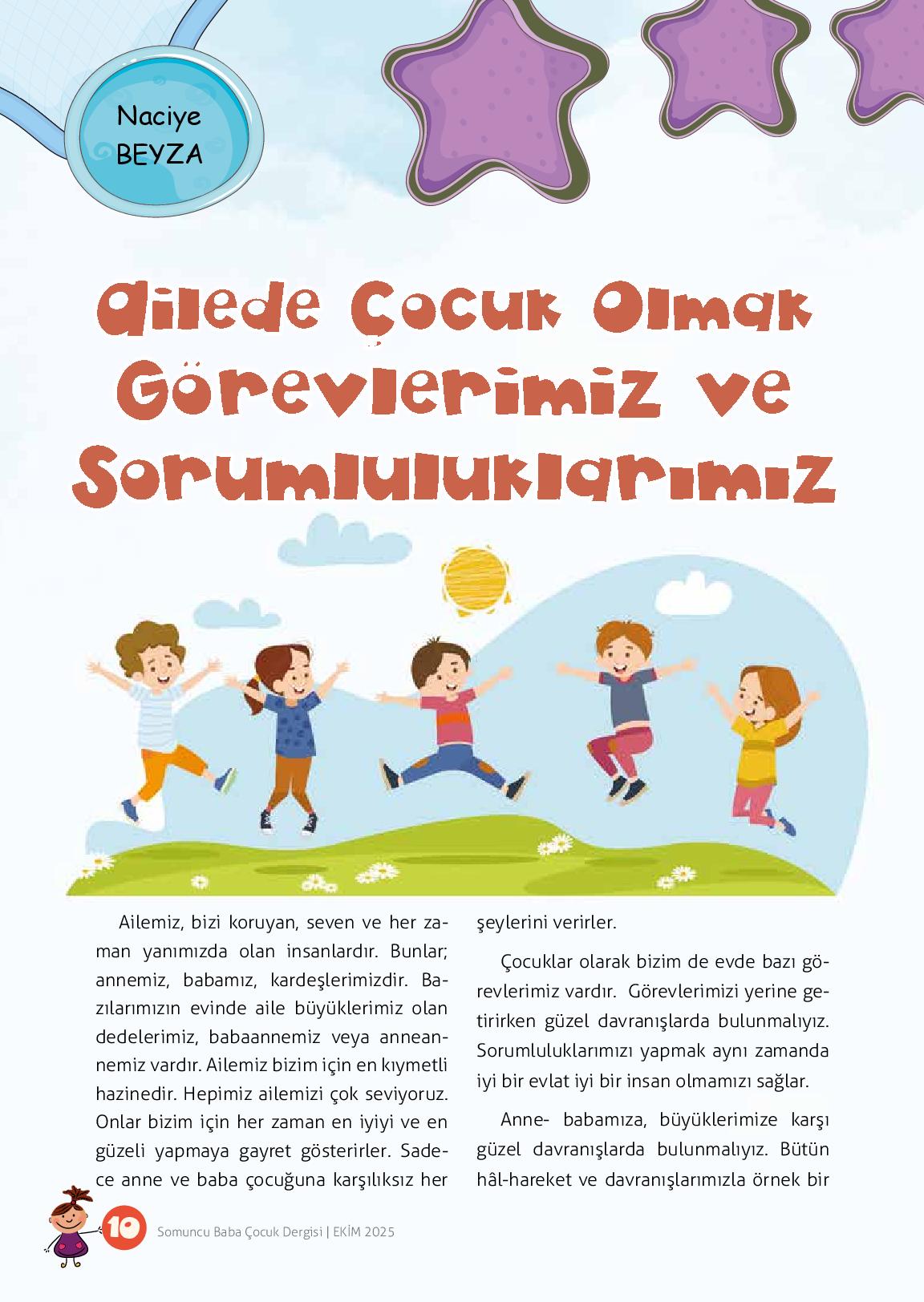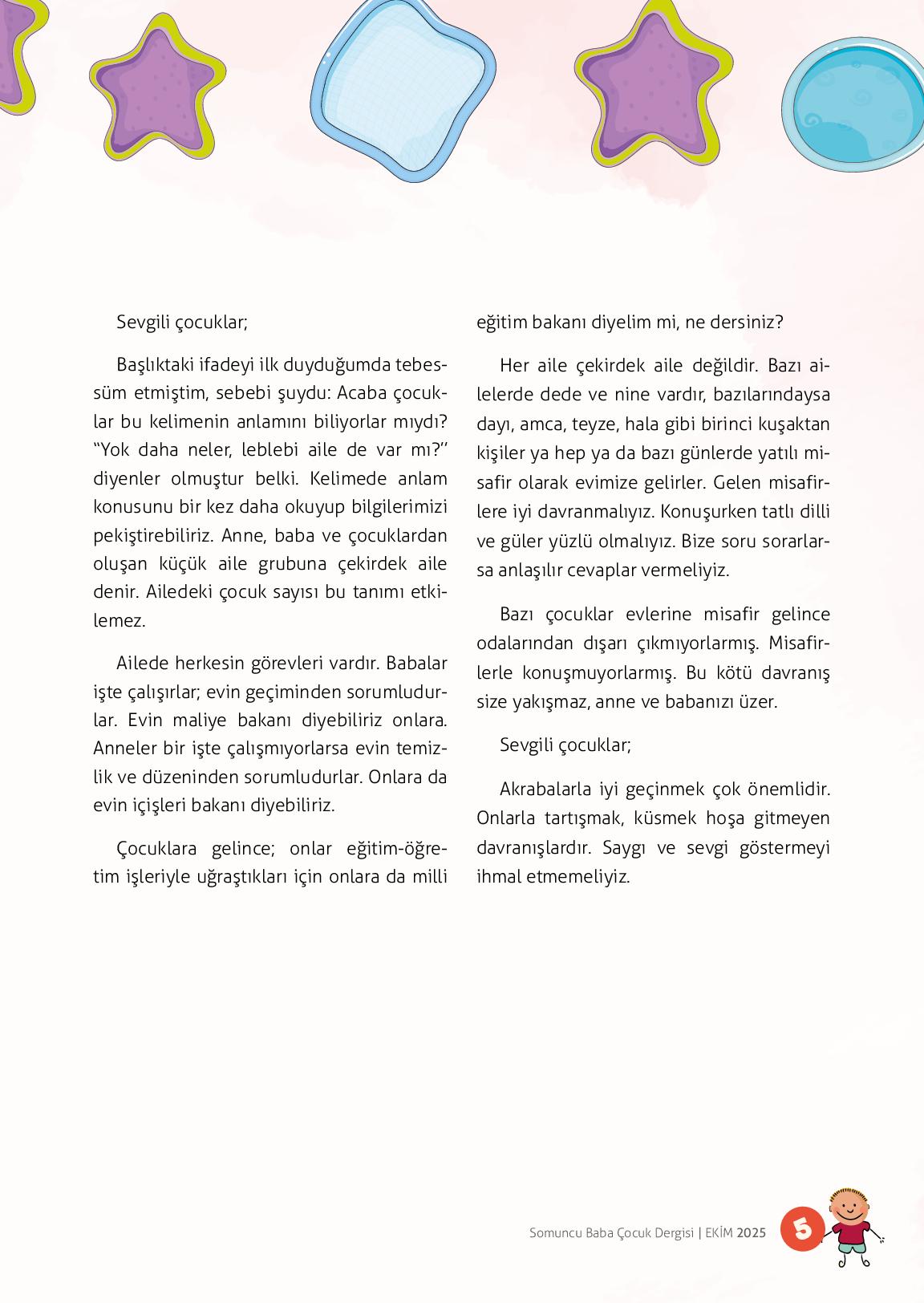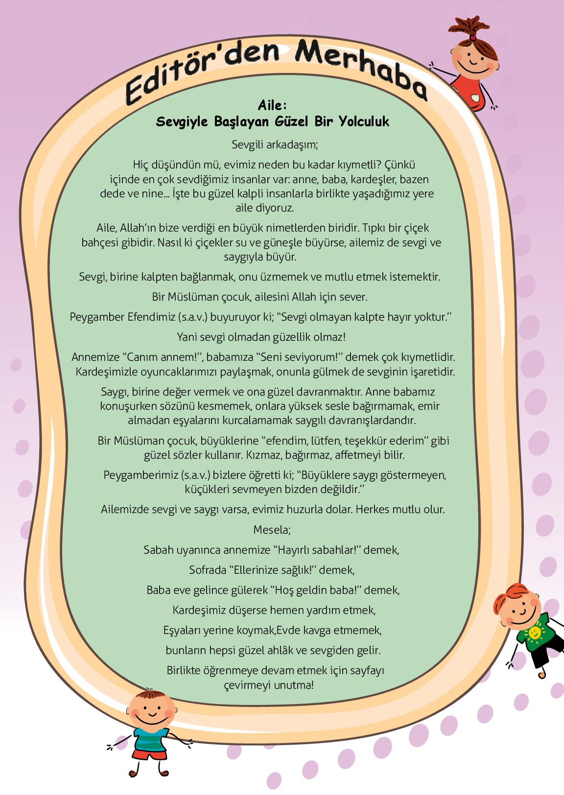 Sevgili arkadaşım;Hiç düşündün mü, evimiz neden bu kadar kıymetli? Çünkü içinde en çok sevdiğimiz insanlar var: anne, baba, kardeşler, bazen dede ve nine... İşte bu güzel kalpli insanlarla birlikte yaşadığımız yere aile diyoruz.Aile, Allah’ın bize verdiği en...