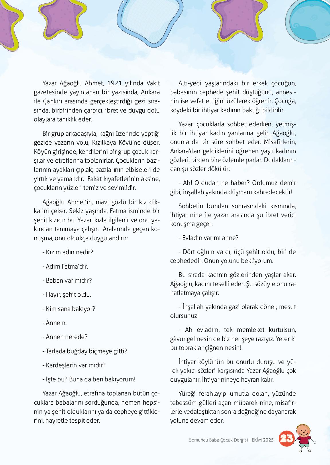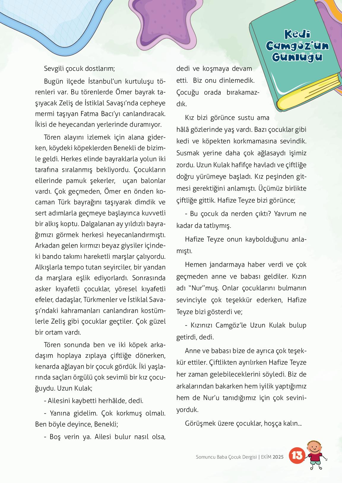 Sevgili çocuk dostlarım;Bugün ilçede İstanbul’un kurtuluşu törenleri var. Bu törenlerde Ömer bayrak taşıyacak Zeliş de İstiklal Savaşı’nda cepheye mermi taşıyan Fatma Bacı’yı canlandıracak. İkisi de heyecandan yerlerinde duramıyor.Tören alayını izlemek için alana ...
