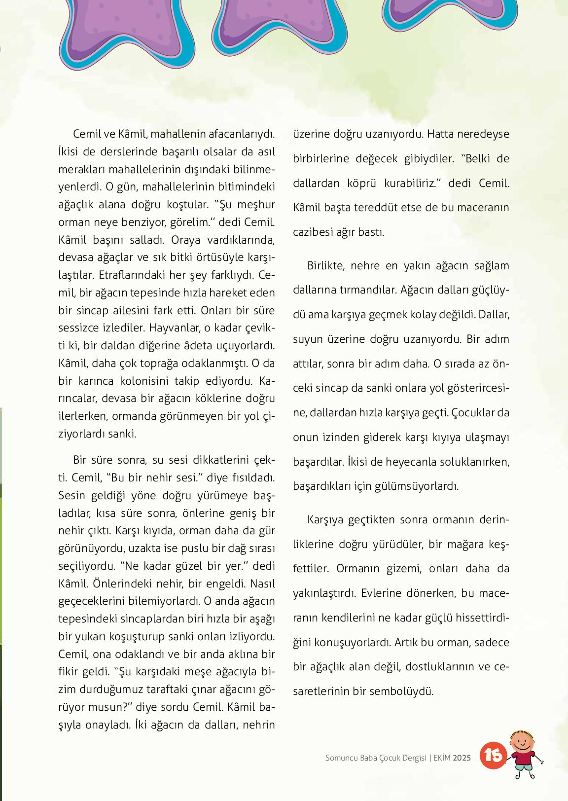 Cemil ve Kâmil, mahallenin afacanlarıydı. İkisi de derslerinde başarılı olsalar da asıl merakları mahallelerinin dışındaki bilinmeyenlerdi. O gün, mahallelerinin bitimindeki ağaçlık alana doğru koştular. “Şu meşhur orman neye benziyor, görelim.” dedi Cemil. Kâmil başını salladı. Oraya vard...