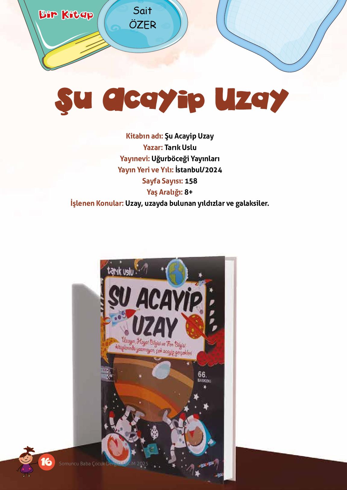 Kitabın adı: Şu Acayip UzayYazar: Tarık UsluYayınevi: Uğurböceği YayınlarıYayın Yeri ve Yılı: İstanbul/2024Sayfa Sayısı: 158Yaş Aralığı: 8+İşlenen Konular: Uzay, uzayda bulunan yıldızlar ve galaksiler.Şöyle başımızı havaya kaldırıp da gökyüzüne baktığımızda heyecanlanmamak mümkün değil...
