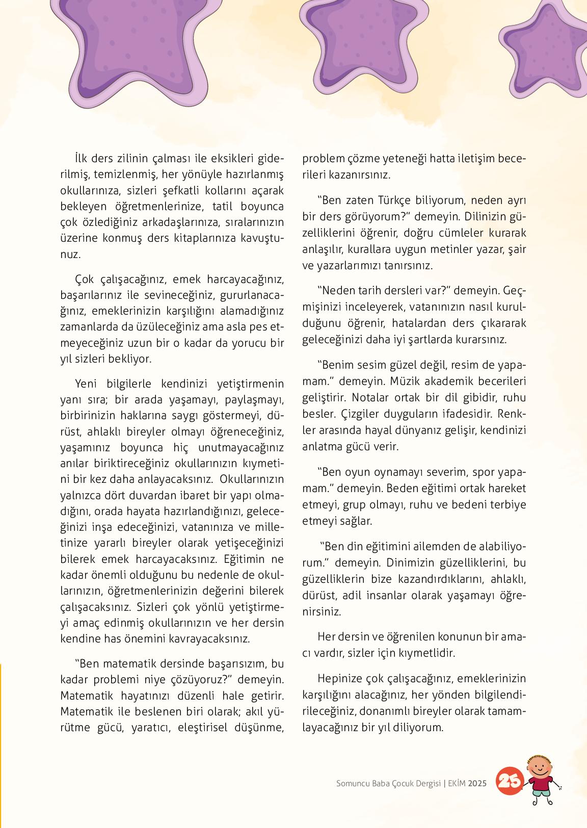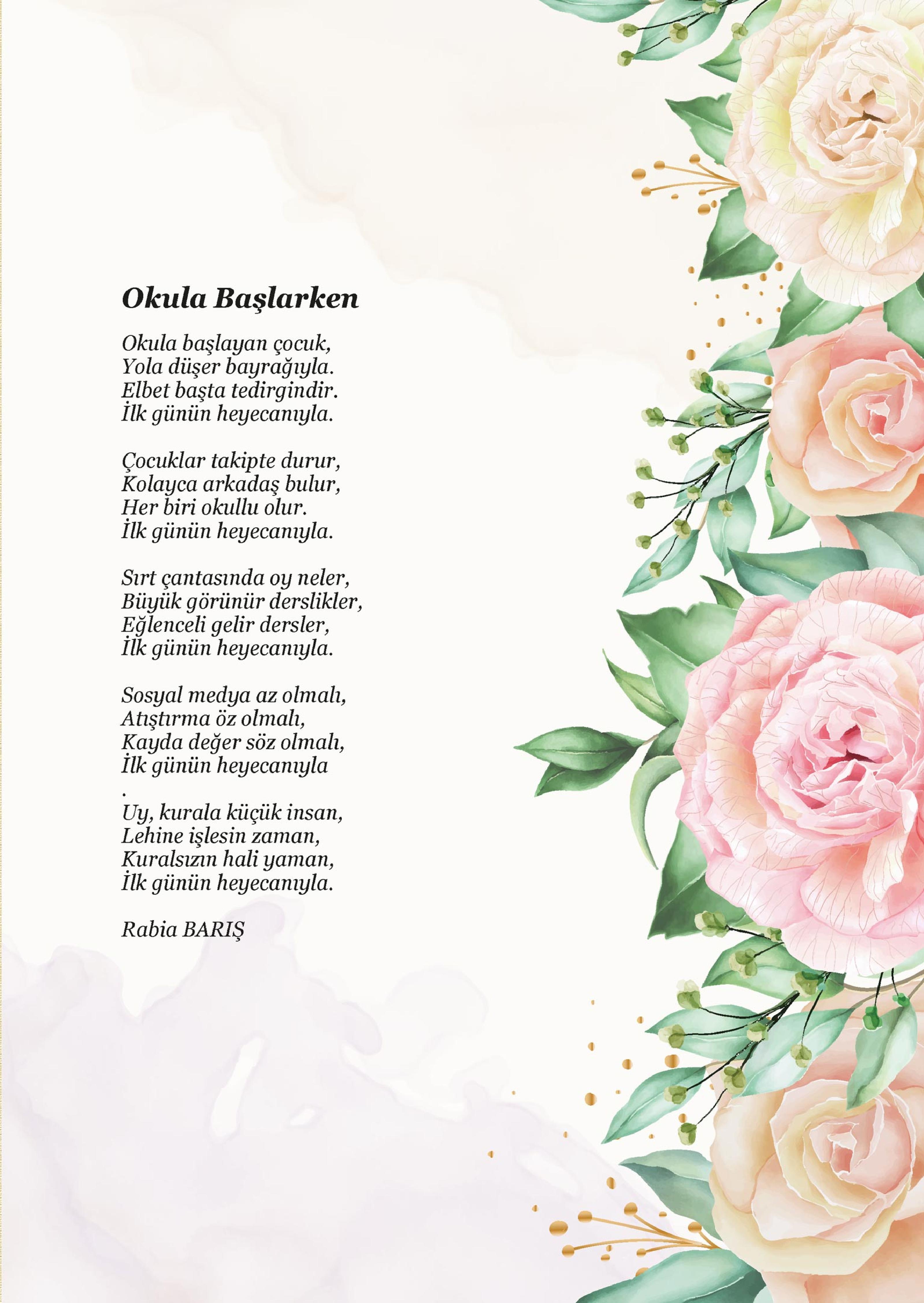İlk ders zilinin çalması ile eksikleri giderilmiş, temizlenmiş, her yönüyle hazırlanmış okullarınıza, sizleri şefkatli kollarını açarak bekleyen öğretmenlerinize, tatil boyunca çok özlediğiniz arkadaşlarınıza, sıralarınızın üzerine konmuş ders kitaplarınıza kavuştunuz.Çok çalışacağınız...