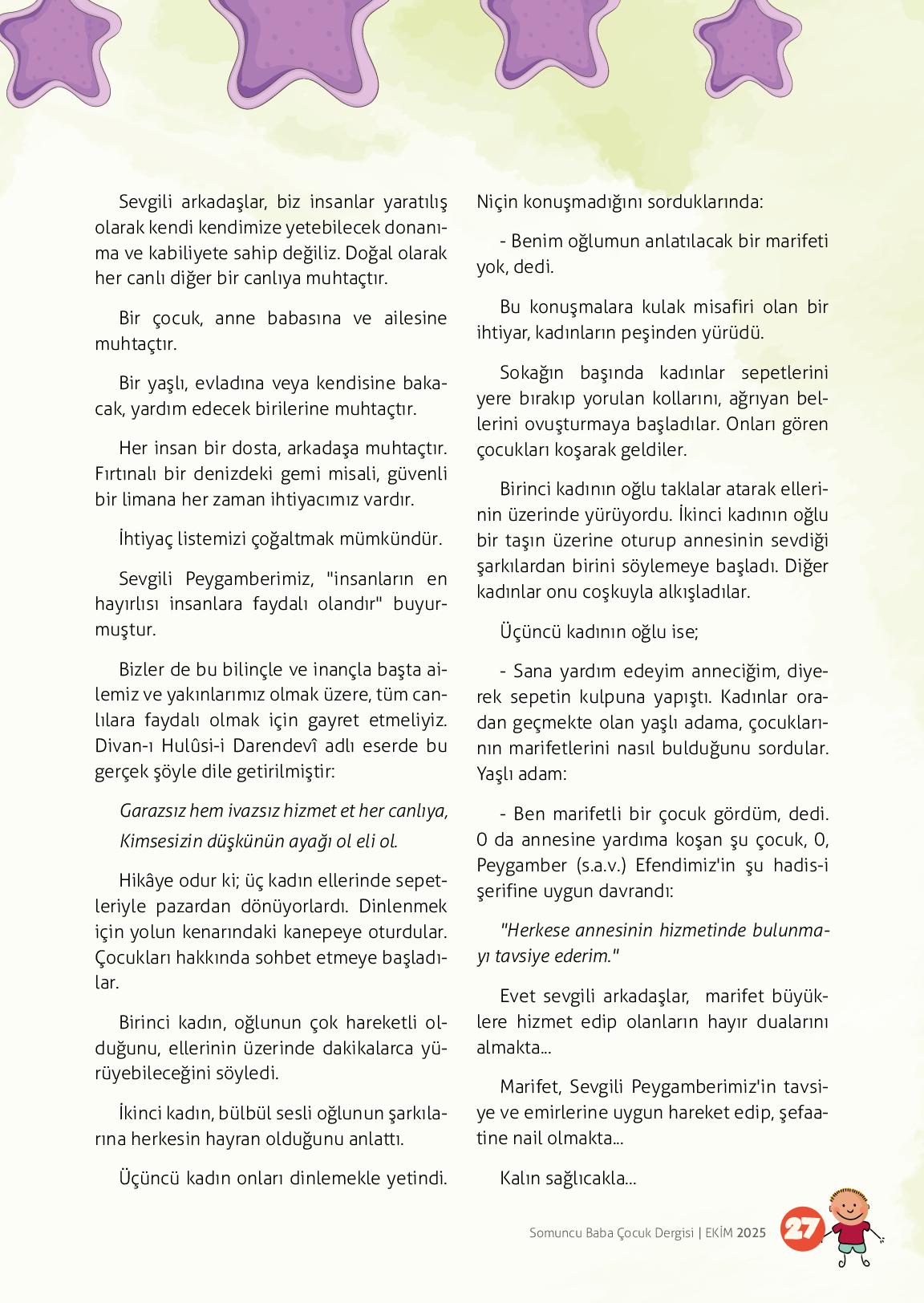 Sevgili arkadaşlar, biz insanlar yaratılış olarak kendi kendimize yetebilecek donanıma ve kabiliyete sahip değiliz. Doğal olarak her canlı diğer bir canlıya muhtaçtır.Bir çocuk, anne babasına ve ailesine muhtaçtır.Bir yaşlı, evladına veya kendisine bakacak, yardım edecek birilerine muht...