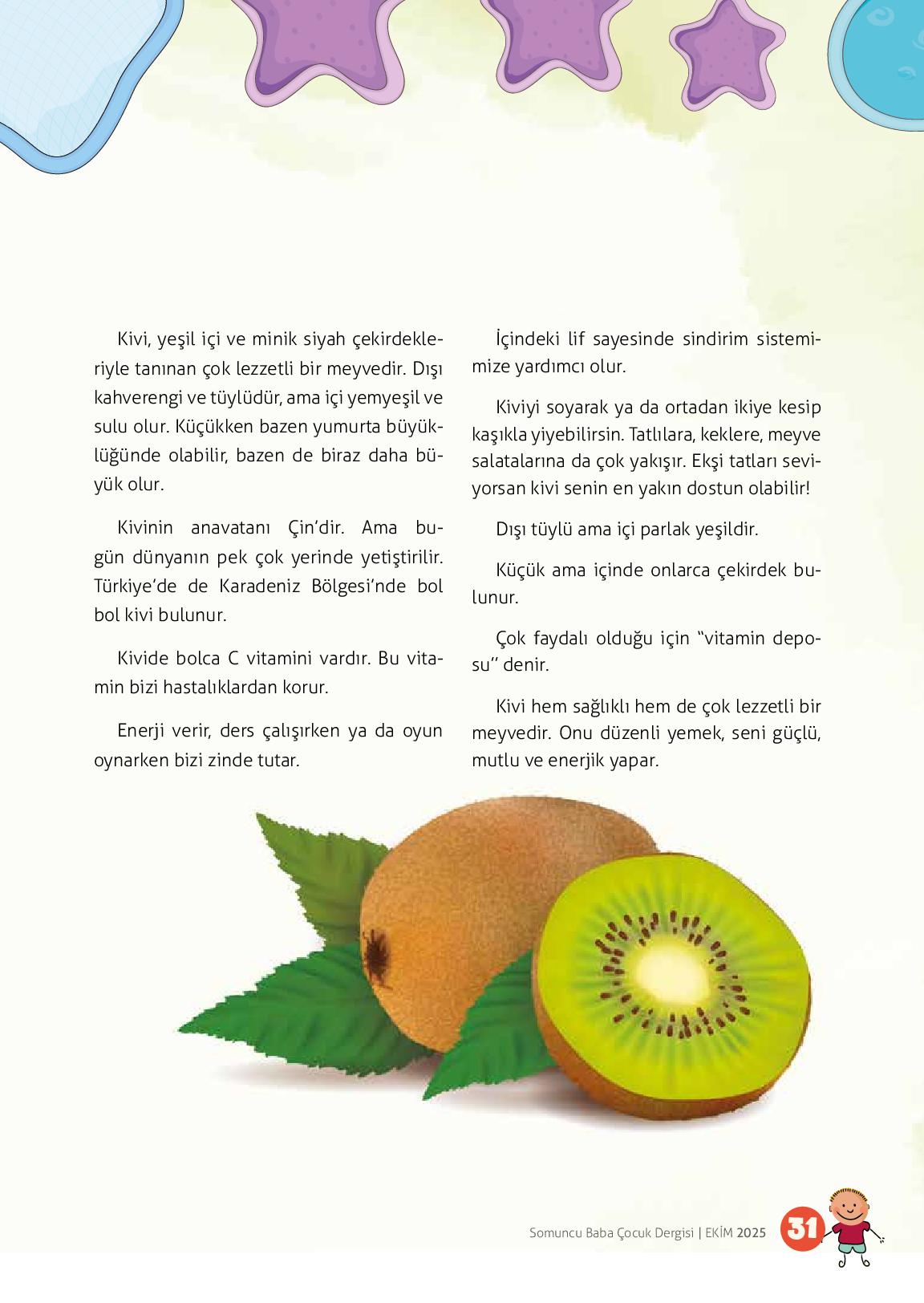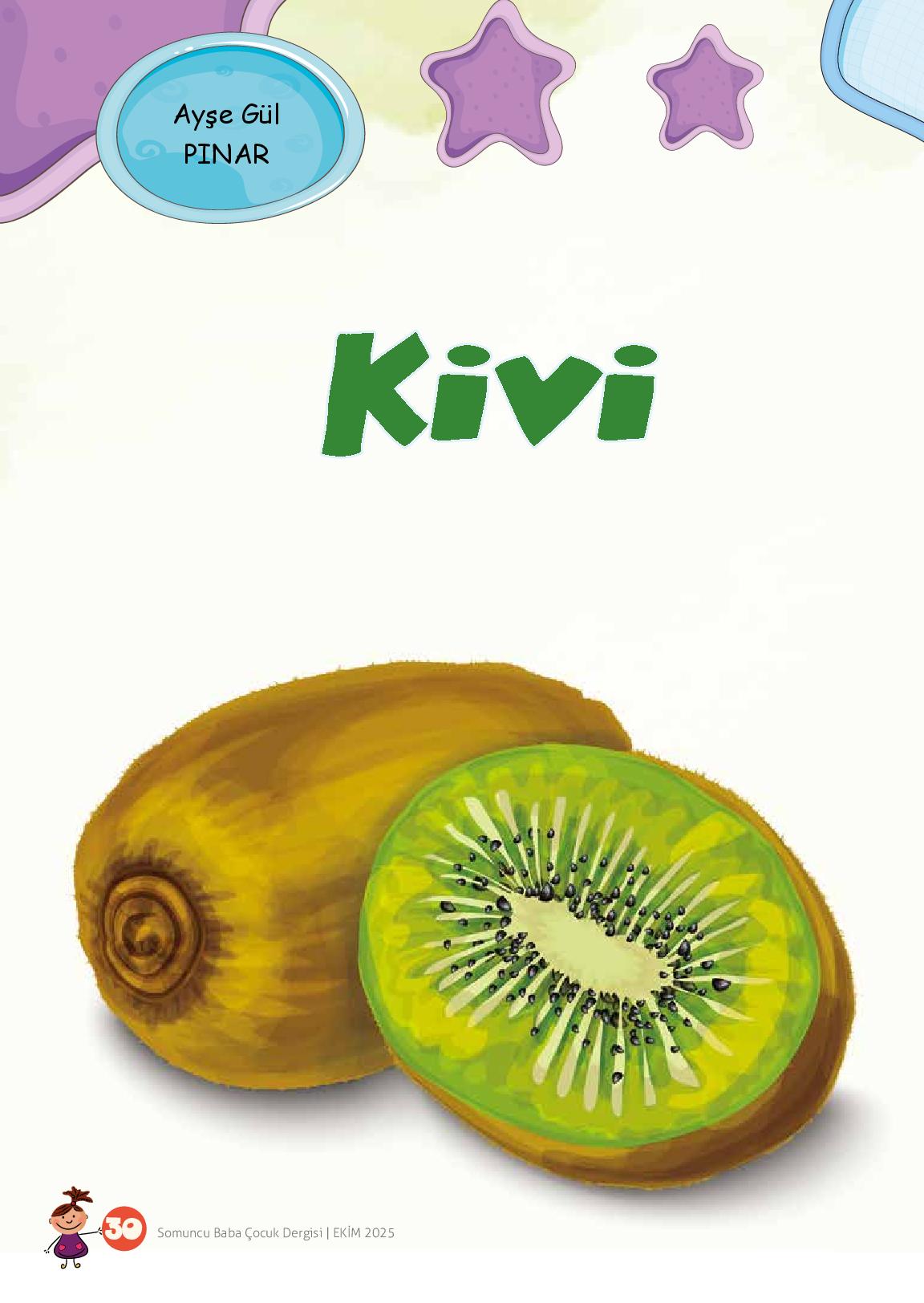 Kivi, yeşil içi ve minik siyah çekirdekleriyle tanınan çok lezzetli bir meyvedir. Dışı kahverengi ve tüylüdür, ama içi yemyeşil ve sulu olur. Küçükken bazen yumurta büyüklüğünde olabilir, bazen de biraz daha büyük olur.Kivinin anavatanı Çin’dir. Ama bugün dünyanın pek çok yerinde yetiştirilir. T...