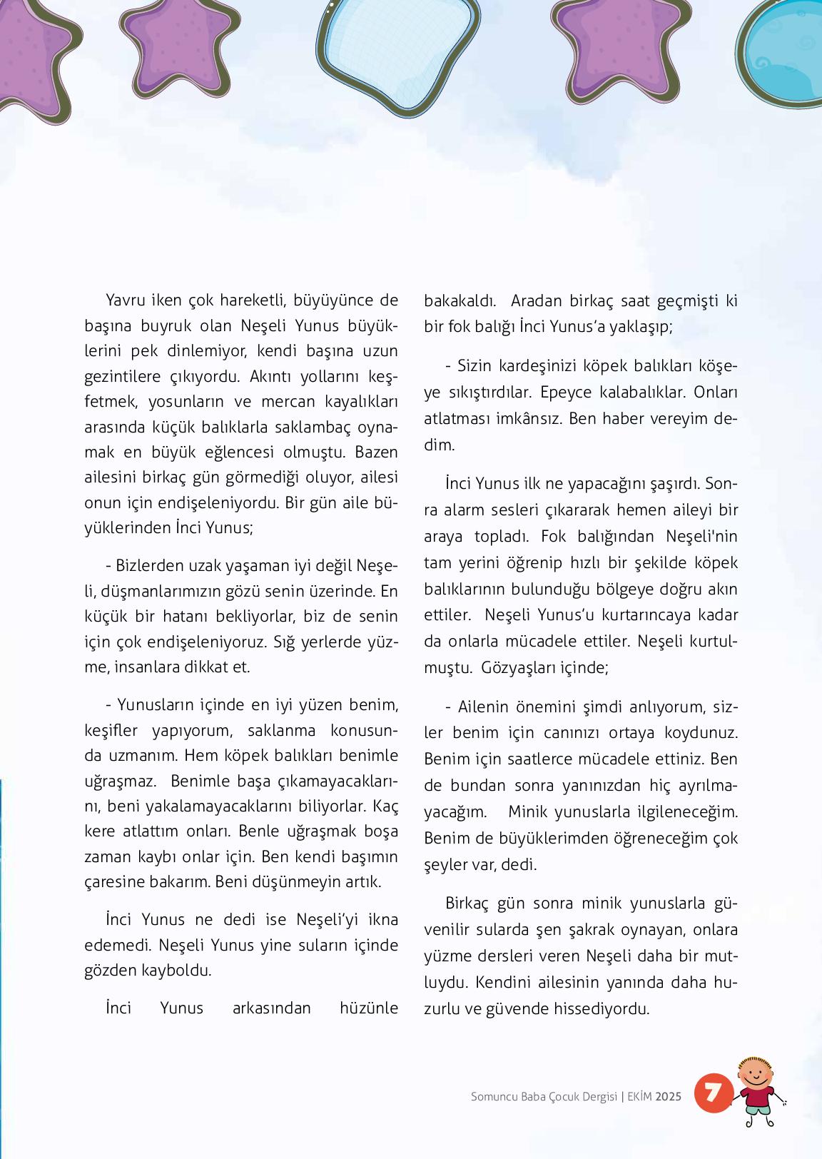 Yavru iken çok hareketli, büyüyünce de başına buyruk olan Neşeli Yunus büyüklerini pek dinlemiyor, kendi başına uzun gezintilere çıkıyordu. Akıntı yollarını keşfetmek, yosunların ve mercan kayalıkları arasında küçük balıklarla saklambaç oynamak en büyük eğlencesi olmuştu. Bazen ailesini ...
