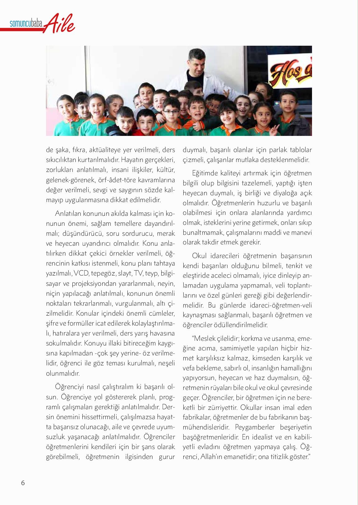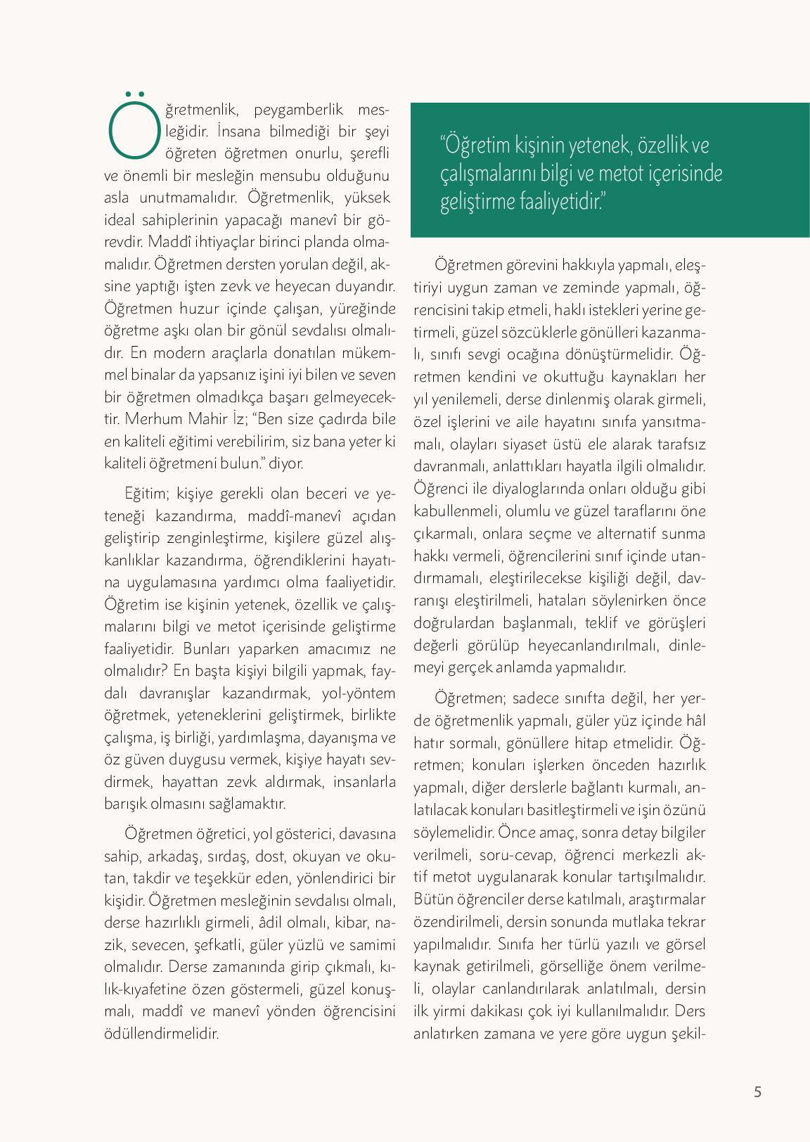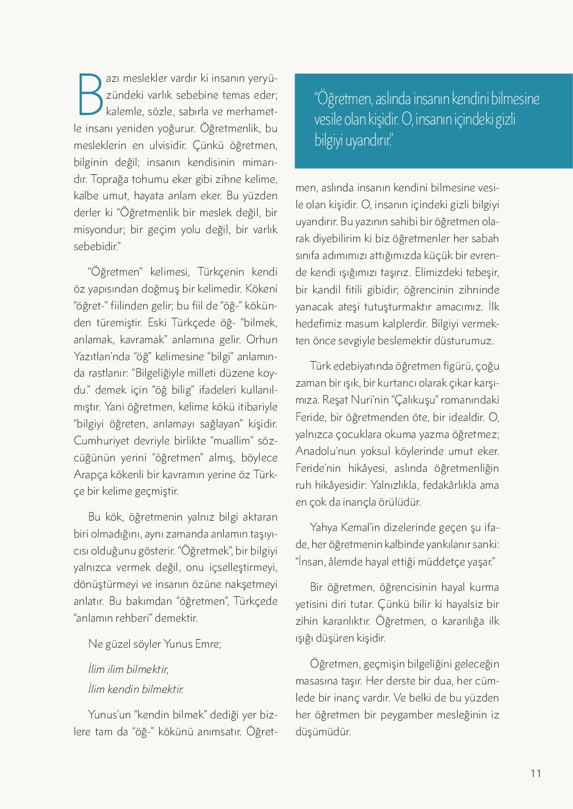 Öğretmenlik, peygamberlik mesleğidir. İnsana bilmediği bir şeyi öğreten öğretmen onurlu, şerefli ve önemli bir mesleğin mensubu olduğunu asla unutmamalıdır. Öğretmenlik, yüksek ideal sahiplerinin yapacağı manevî bir görevdir. Maddî ihtiyaçlar birinci planda olmama...