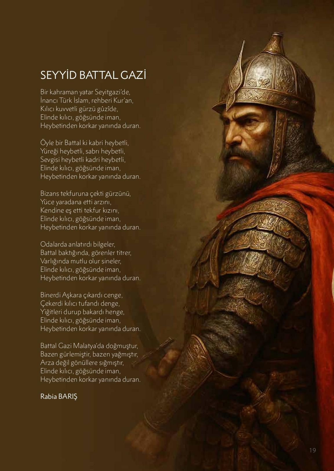 Bir kahraman yatar Seyitgazi’de,İnancı Türk İslam, rehberi Kur’an,Kılıcı kuvvetli gürzü gûzîde,Elinde kılıcı, göğsünde iman,Heybetinden korkar yanında duran.Öyle bir Battal ki kabri heybetli,Yüreği heybetli, sabrı heybetli,Sevgisi heybetli kadri heybetli,Elinde kılıcı, göğsünde ima...