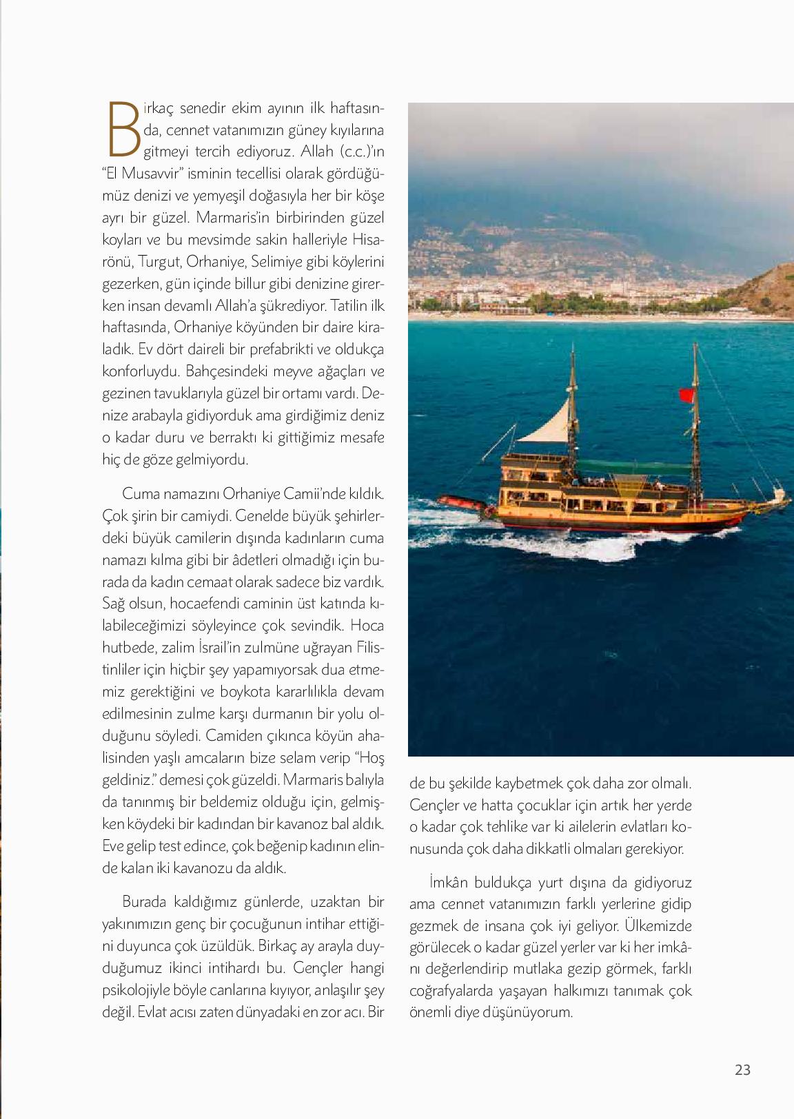 Birkaç senedir ekim ayının ilk haftasında, cennet vatanımızın güney kıyılarına gitmeyi tercih ediyoruz. Allah (c.c.)’ın “El Musavvir” isminin tecellisi olarak gördüğümüz denizi ve yemyeşil doğasıyla her bir köşe ayrı bir güzel. Marmaris’in birbirinden güzel koyları ve bu mevsim...