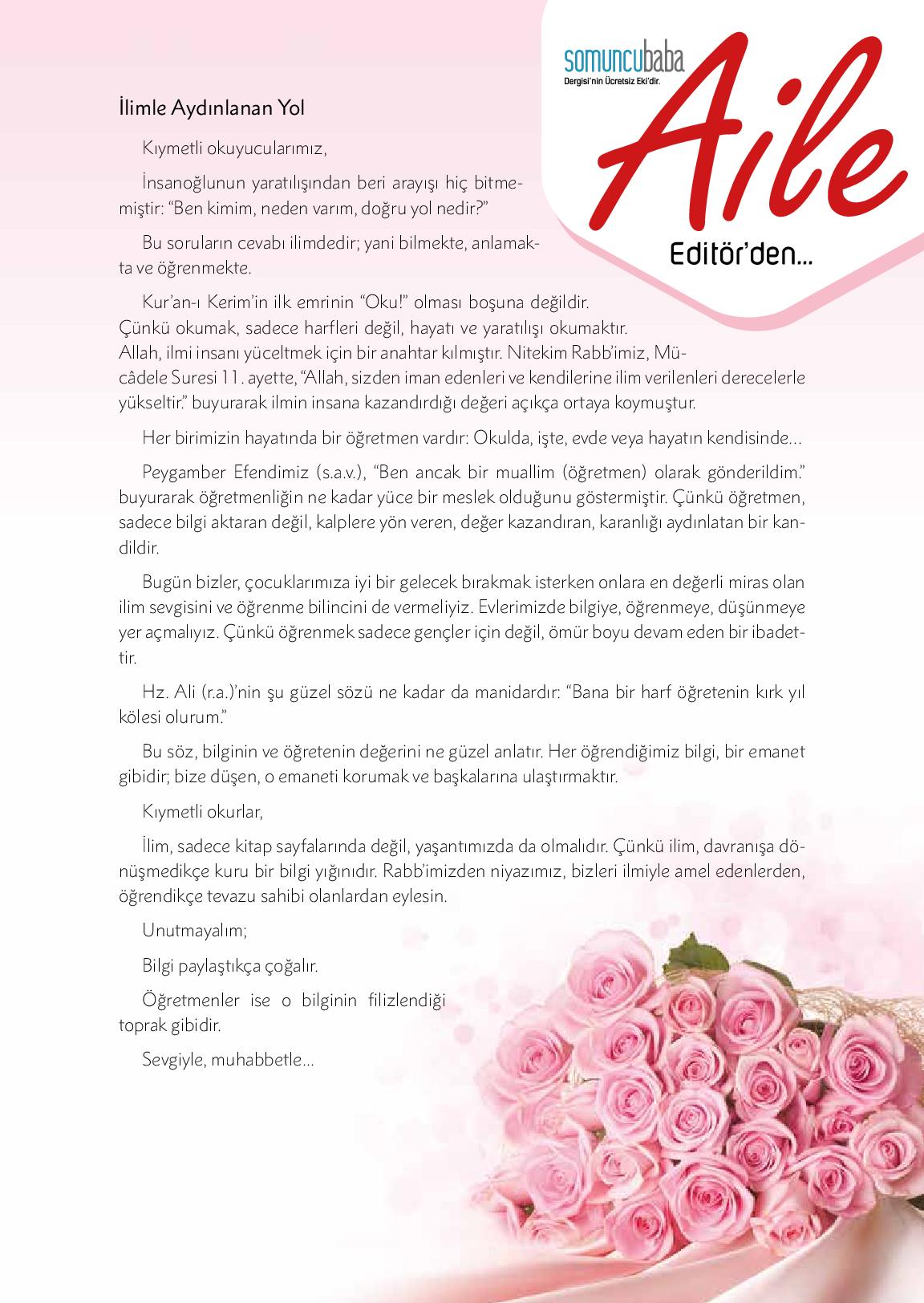 Kıymetli okuyucularımız,İnsanoğlunun yaratılışından beri arayışı hiç bitmemiştir: “Ben kimim, neden varım, doğru yol nedir?”Bu soruların cevabı ilimdedir; yani bilmekte, anlamakta ve öğrenmekte.Kur’an-ı Kerim’in ilk emrinin “Oku!” olması boşuna değildir. Çünkü okumak, sadece har...