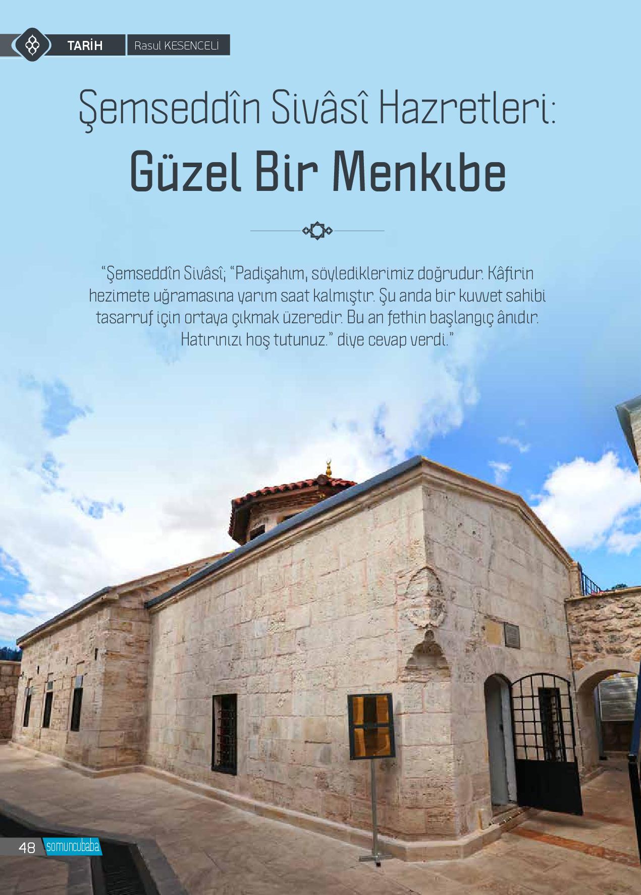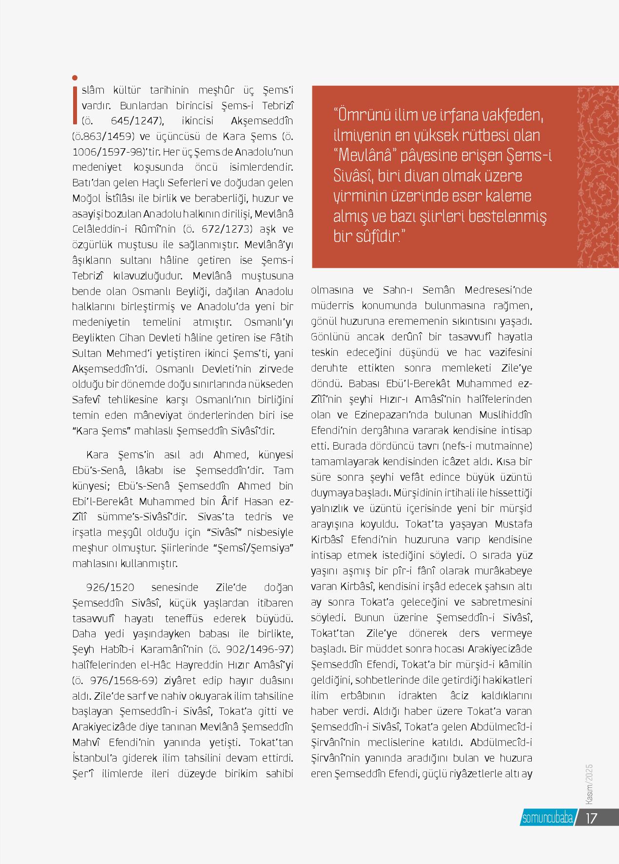 İslâm tarihindeki üç meşhur şemsten biri kabul edilen Şemseddîn-i Sivâsî (k.s), Zile’de dünyaya gelmiş, Tokat ve İstanbul’daki eğitim süreçlerinin ardından Sahn-ı Semân Medreseleri’nden birinde müderris ol...