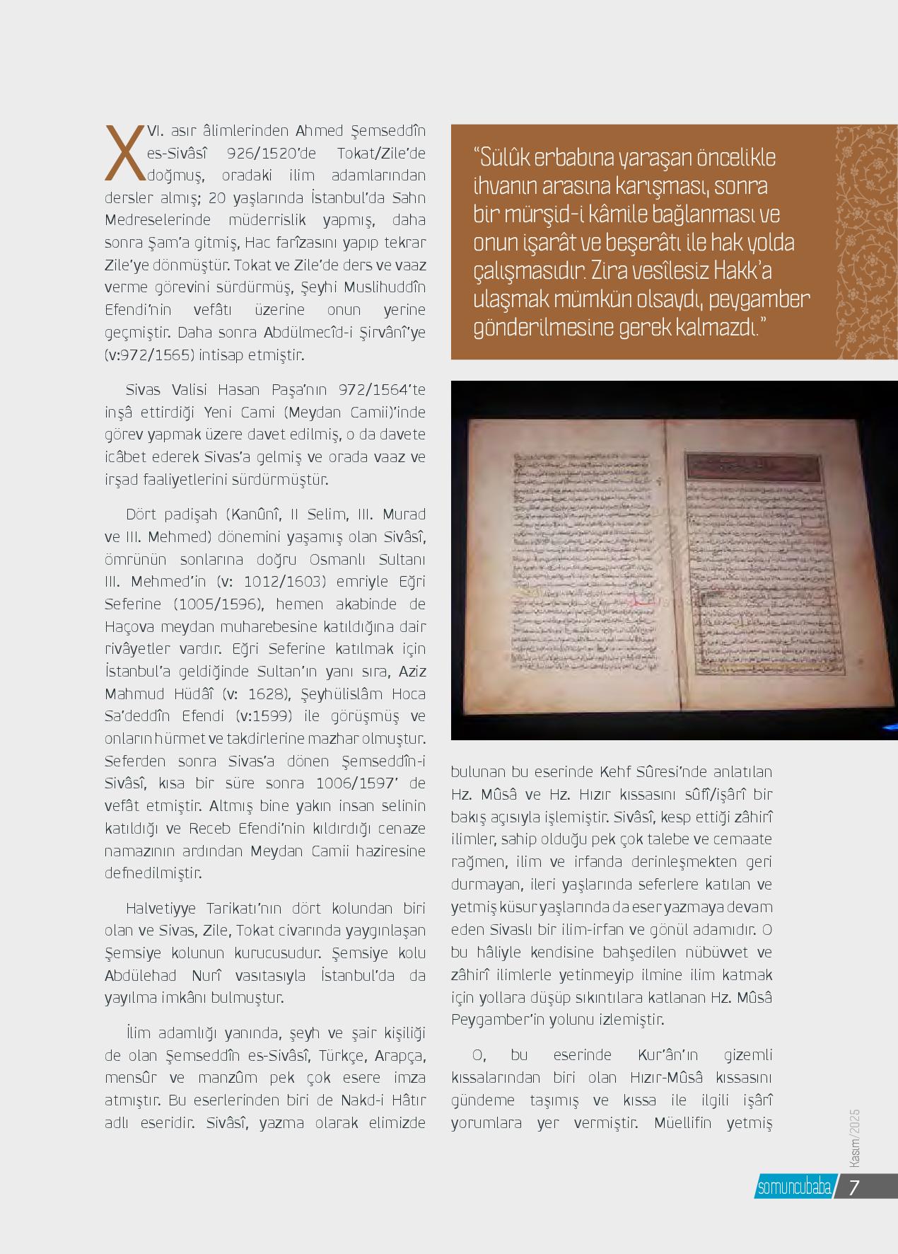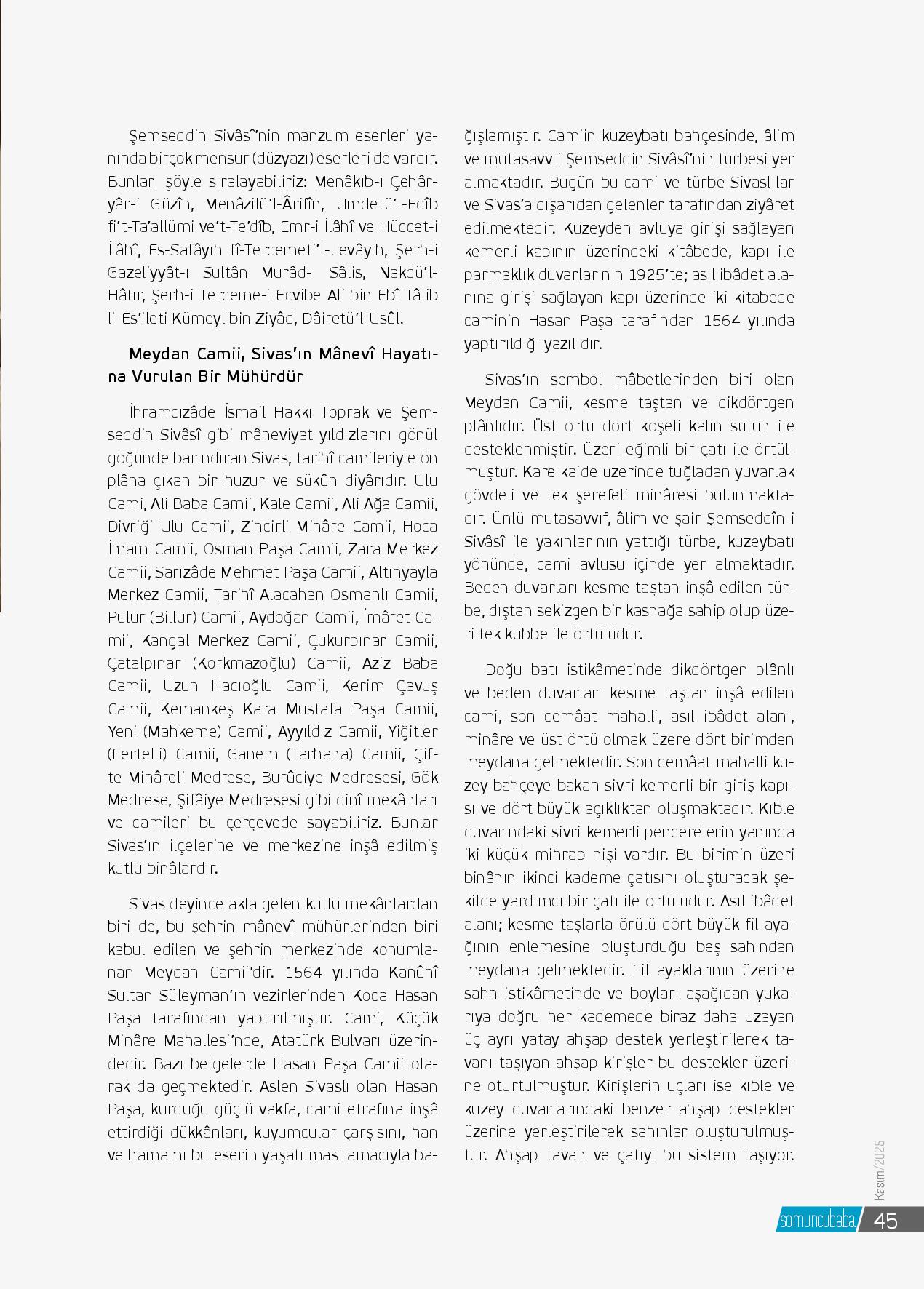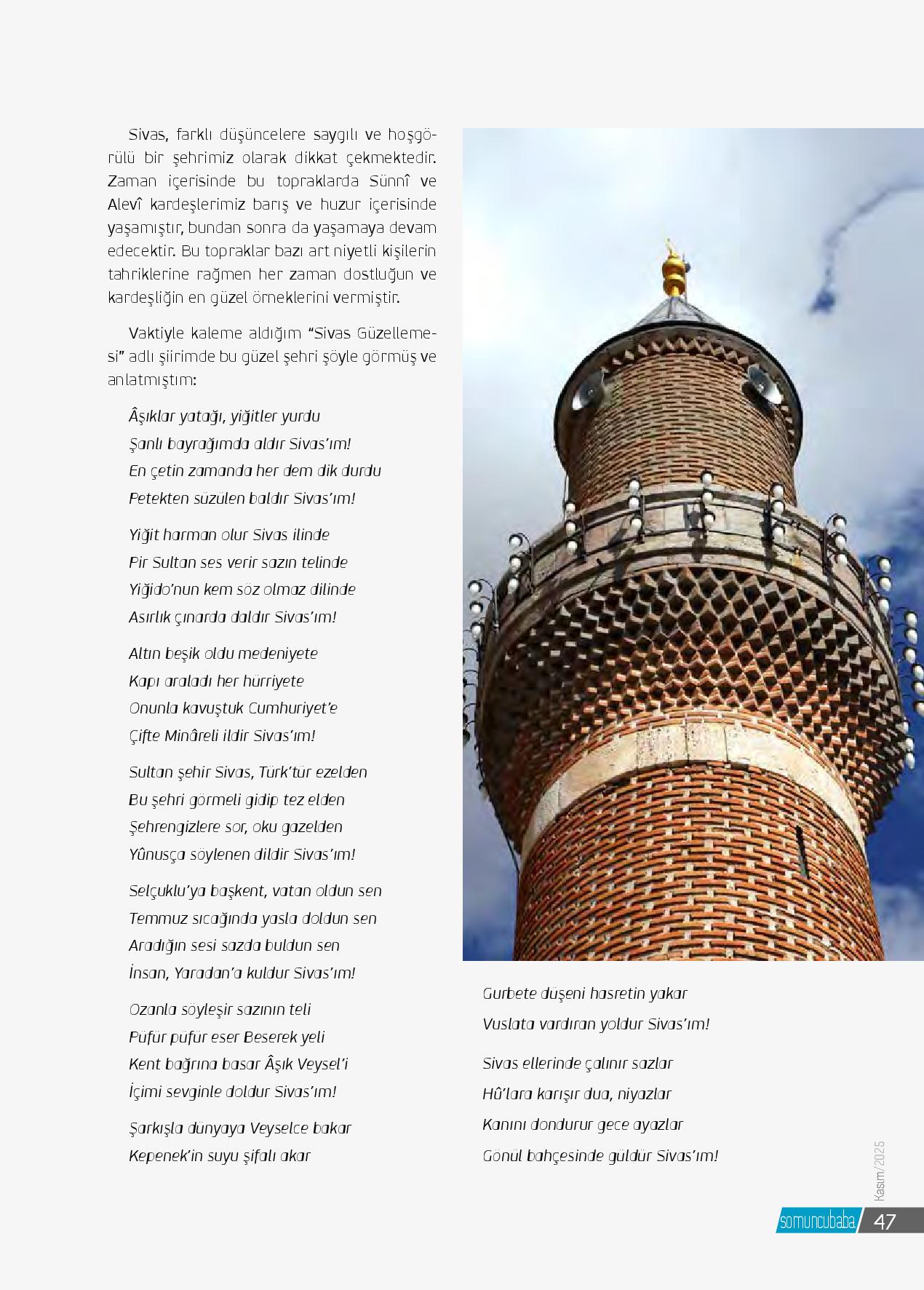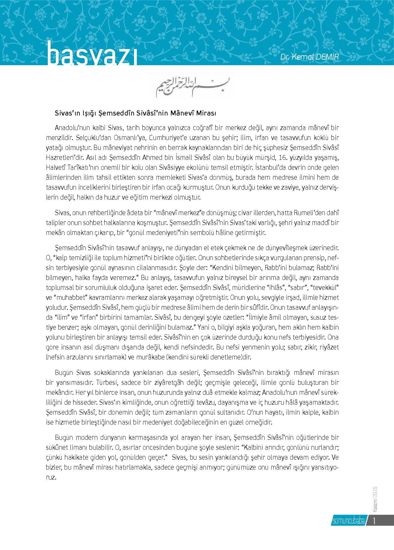 Anadolu’nun kalbi Sivas, tarih boyunca yalnızca coğrafî bir merkez değil, aynı zamanda mânevî bir menzildir. Selçuklu’dan Osmanlı’ya, Cumhuriyet’e uzanan bu şehir; ilim, irfan ve tasavvufun köklü bir yatağı olmuştur. Bu mâneviyat nehrinin en berrak ka...
