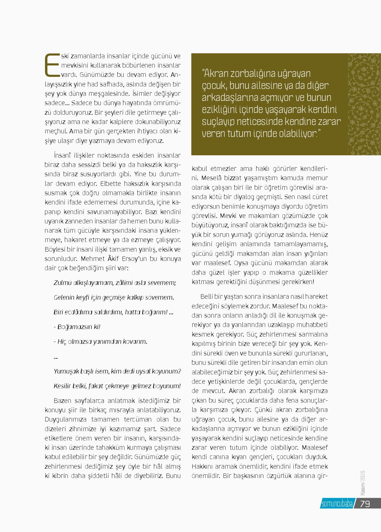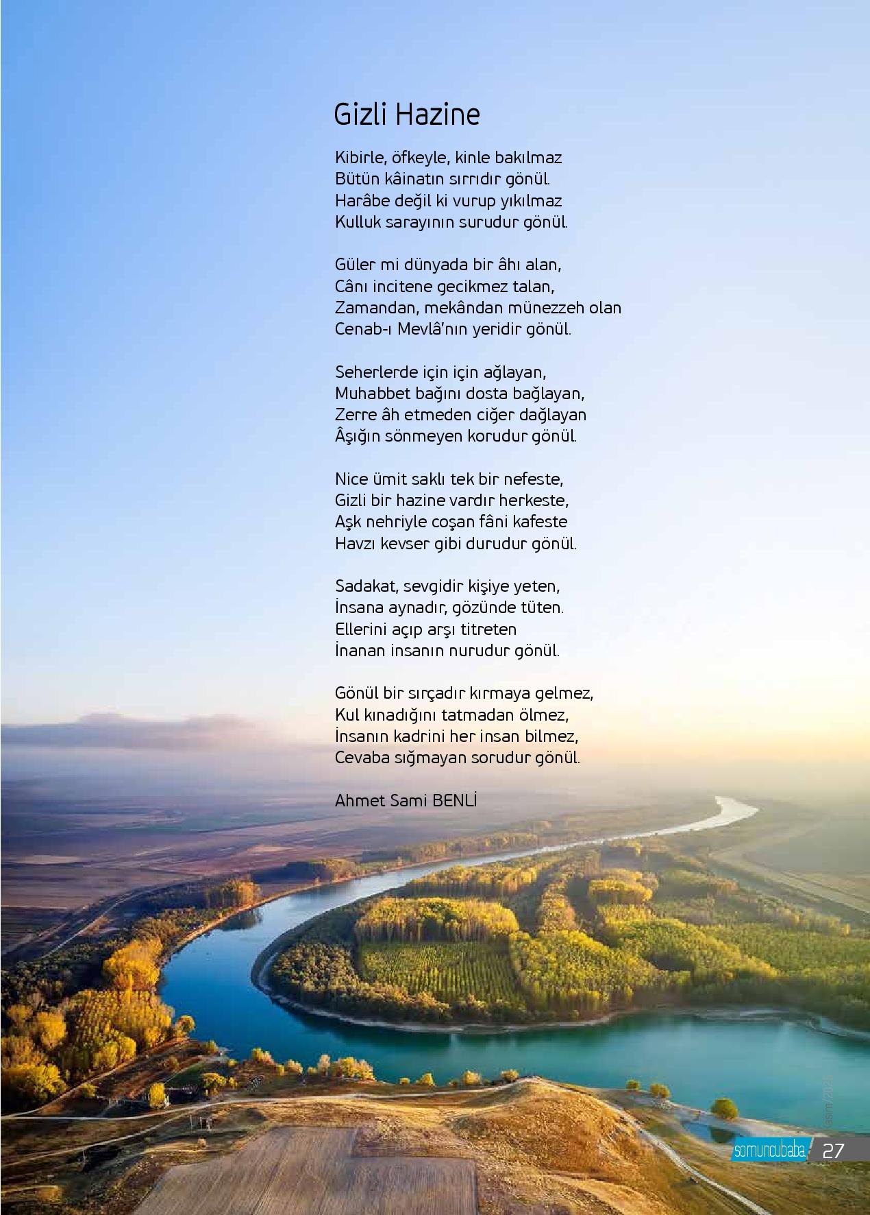 Kibirle, öfkeyle, kinle bakılmazBütün kâinatın sırrıdır gönül.Harâbe değil ki vurup yıkılmazKulluk sarayının surudur gönül.Güler mi dünyada bir âhı alan,Cânı incitene gecikmez talan,Zamandan, mekândan münezzeh olanCenab-ı Mevlâ’nın yeridir gönül.Seherlerde için için ağlayan,Muhabbet bağı...