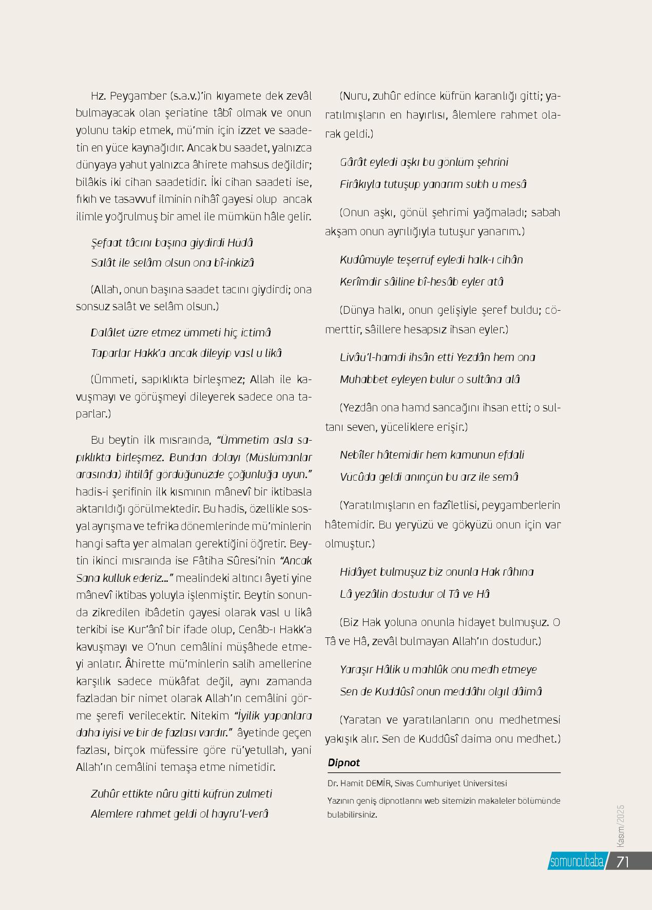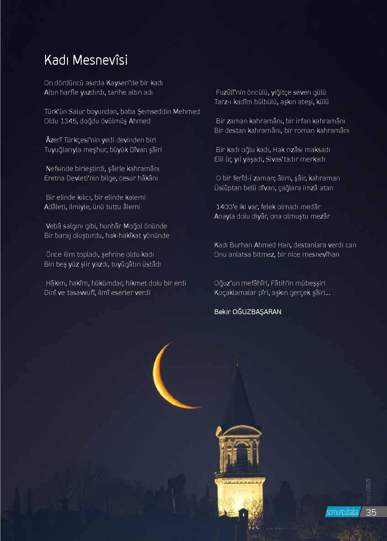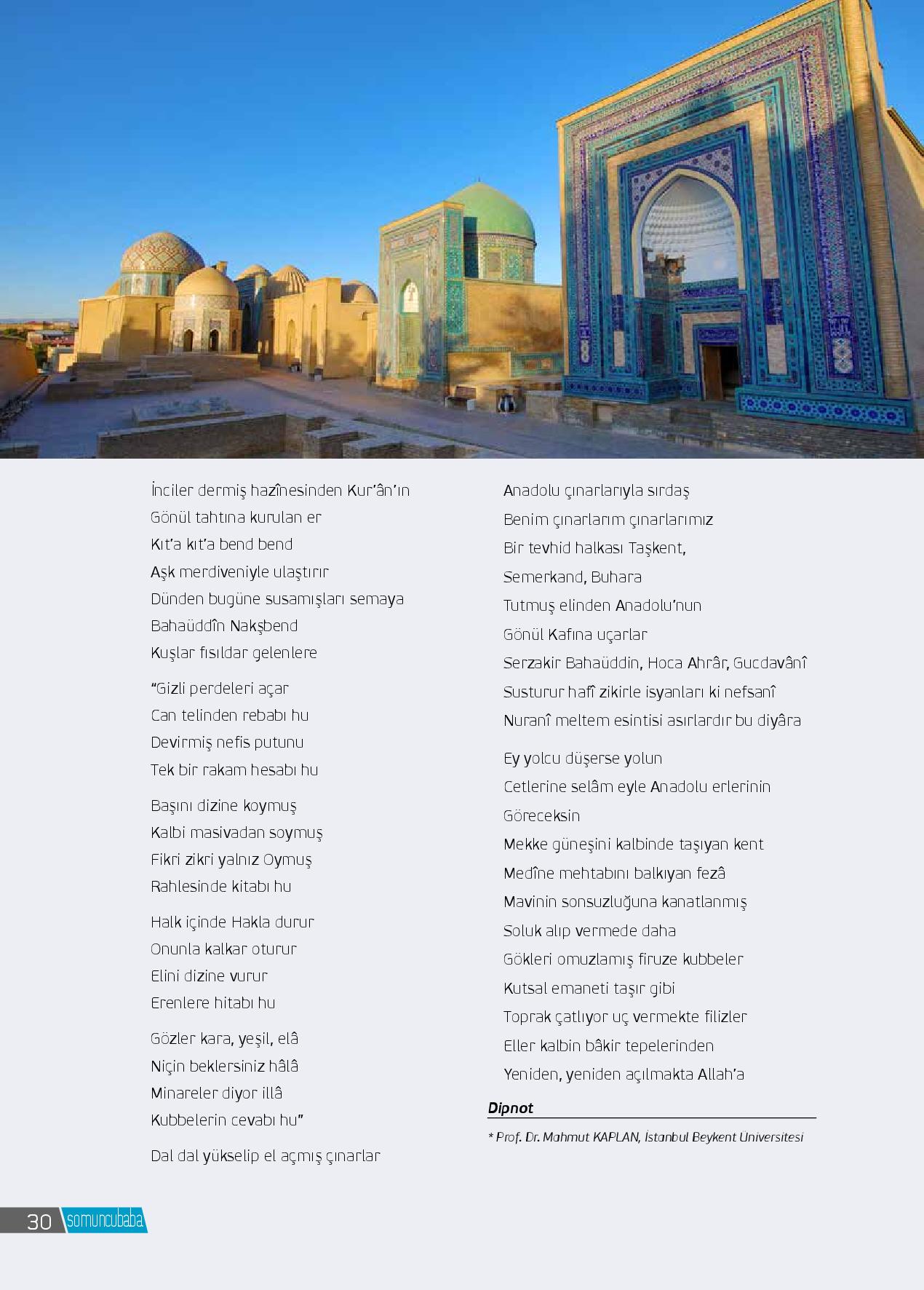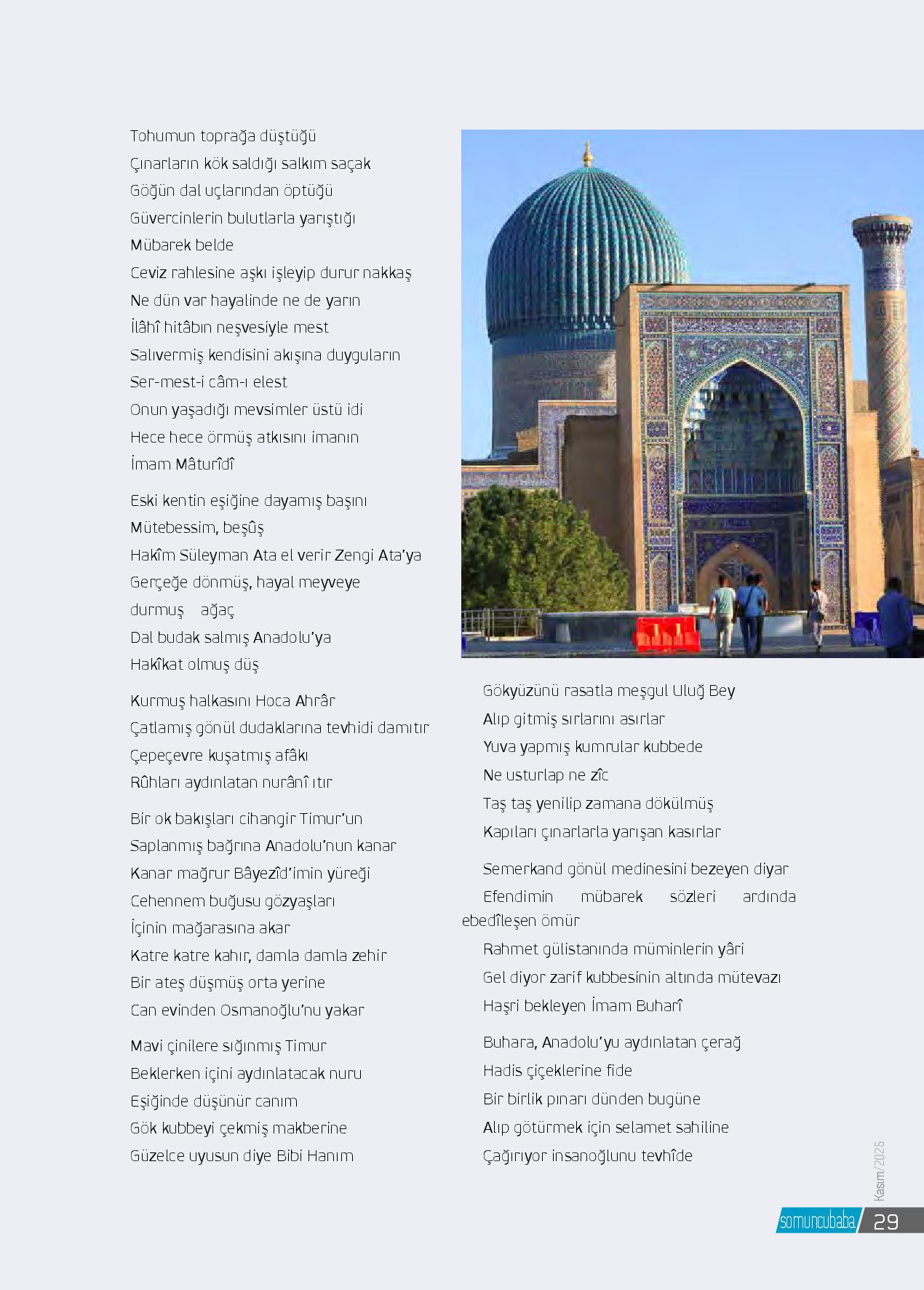 Tohumun toprağa düştüğüÇınarların kök saldığı salkım saçakGöğün dal uçlarından öptüğüGüvercinlerin bulutlarla yarıştığıMübarek beldeCeviz rahlesine aşkı işleyip durur nakkaşNe dün var hayalinde ne de yarınİlâhî hitâbın neşvesiyle mestSalıvermiş kendisini akışına duygularınSer-mest-...
