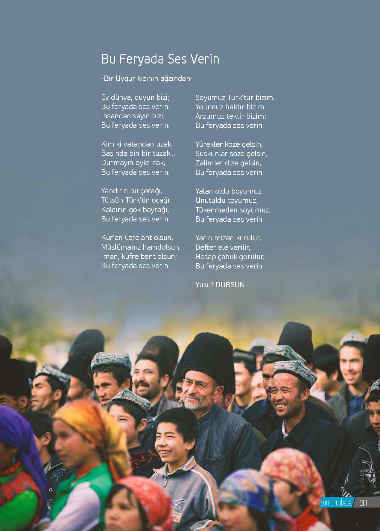-Bir Uygur kızının ağzından-Ey dünya, duyun bizi;Bu feryada ses verin.İnsandan sayın bizi,Bu feryada ses verin.Kim ki vatandan uzak,Başında bin bir tuzak…Durmayın öyle ırak,Bu feryada ses verin.Yandırın bu çerağı,Tütsün Türk’ün ocağı.Kaldırın gök bayrağı,Bu feryada ses verin.Kur’...