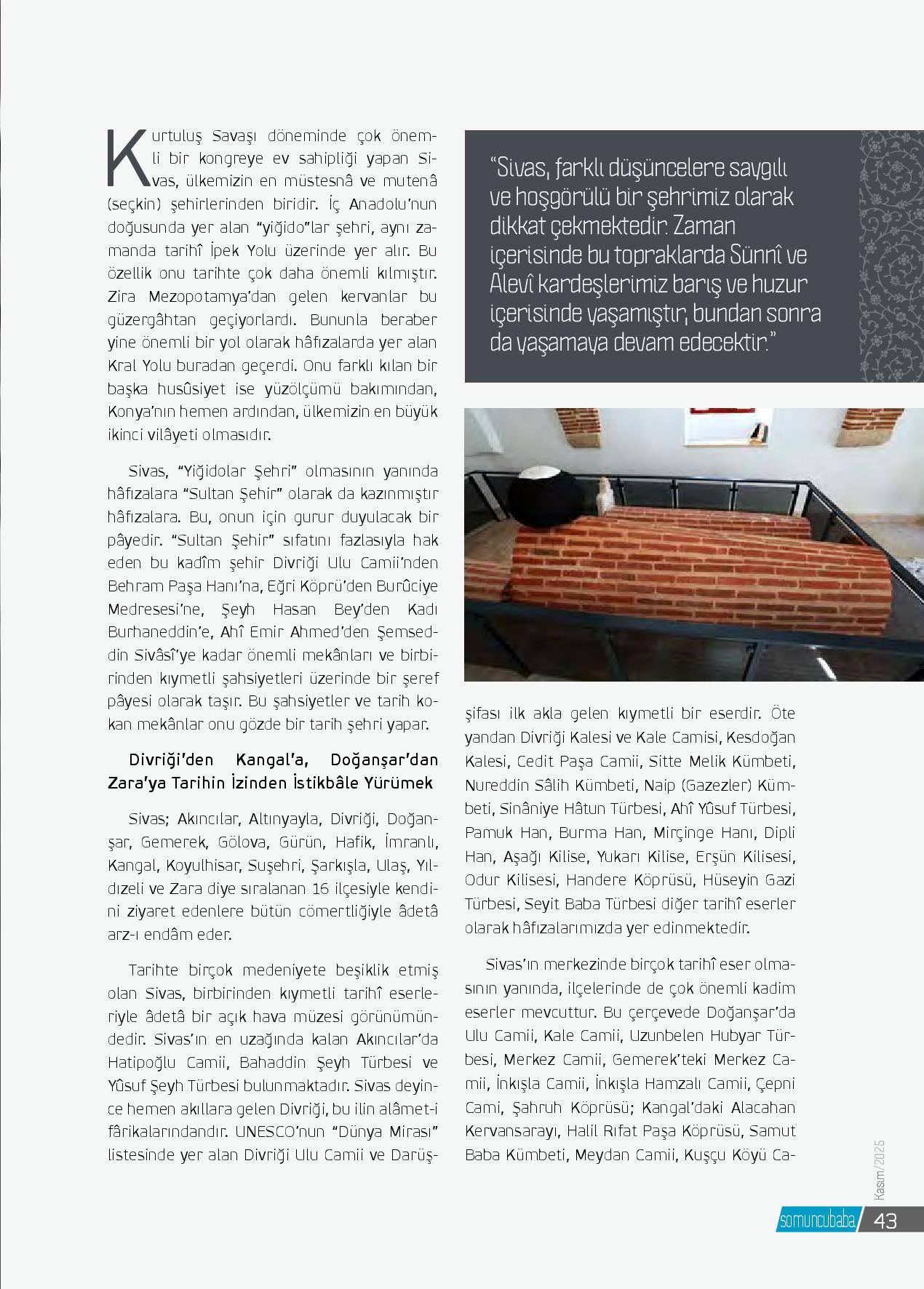 Kurtuluş Savaşı döneminde çok önemli bir kongreye de ev sahipliği yapan Sivas, ülkemizin en müstesnâ ve mutenâ (seçkin) şehirlerinden biridir. İç Anadolu’nun doğusunda yer alan “yiğido”lar şehri, aynı zamanda tarihî İpek Yolu üzerinde yer alır. Bu öz...