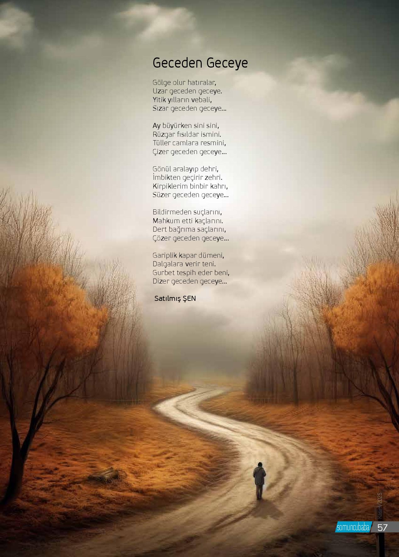 Gölge olur hatıralar,Uzar geceden geceye.Yitik yılların vebali,Sızar geceden geceye...Ay büyürken sini sini,Rüzgar fısıldar ismini.Tüller camlara resmini,Çizer geceden geceye...Gönül aralayıp dehri,İmbikten geçirir zehri.Kirpiklerim binbir kahrı,Süzer geceden geceye...Bildirmeden suçla...