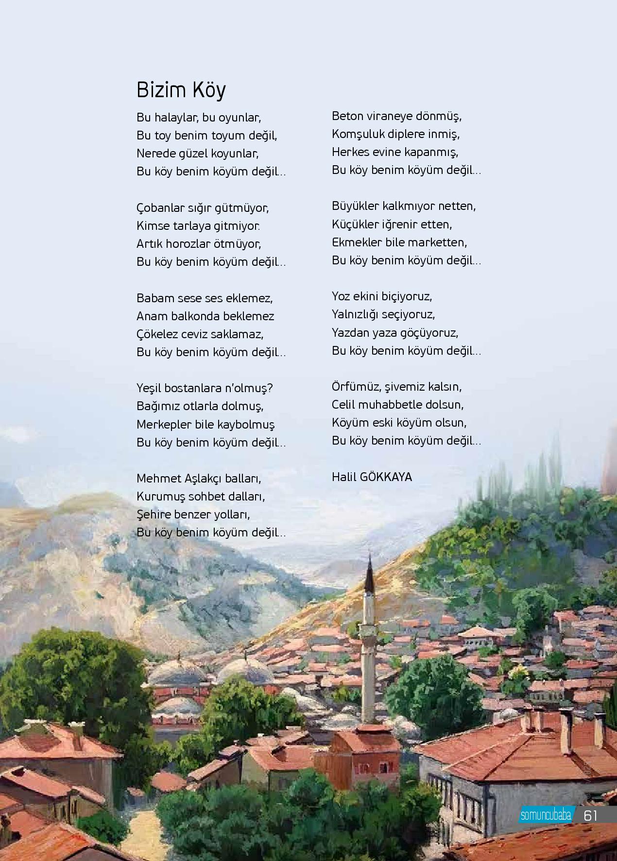 Bu halaylar, bu oyunlar,Bu toy benim toyum değil,Nerede güzel koyunlar,Bu köy benim köyüm değil…Çobanlar sığır gütmüyor,Kimse tarlaya gitmiyor.Artık horozlar ötmüyor,Bu köy benim köyüm değil…Babam sese ses eklemez,Anam balkonda beklemezÇökelez ceviz saklamaz,Bu köy benim köyüm değil…Yeşil b...
