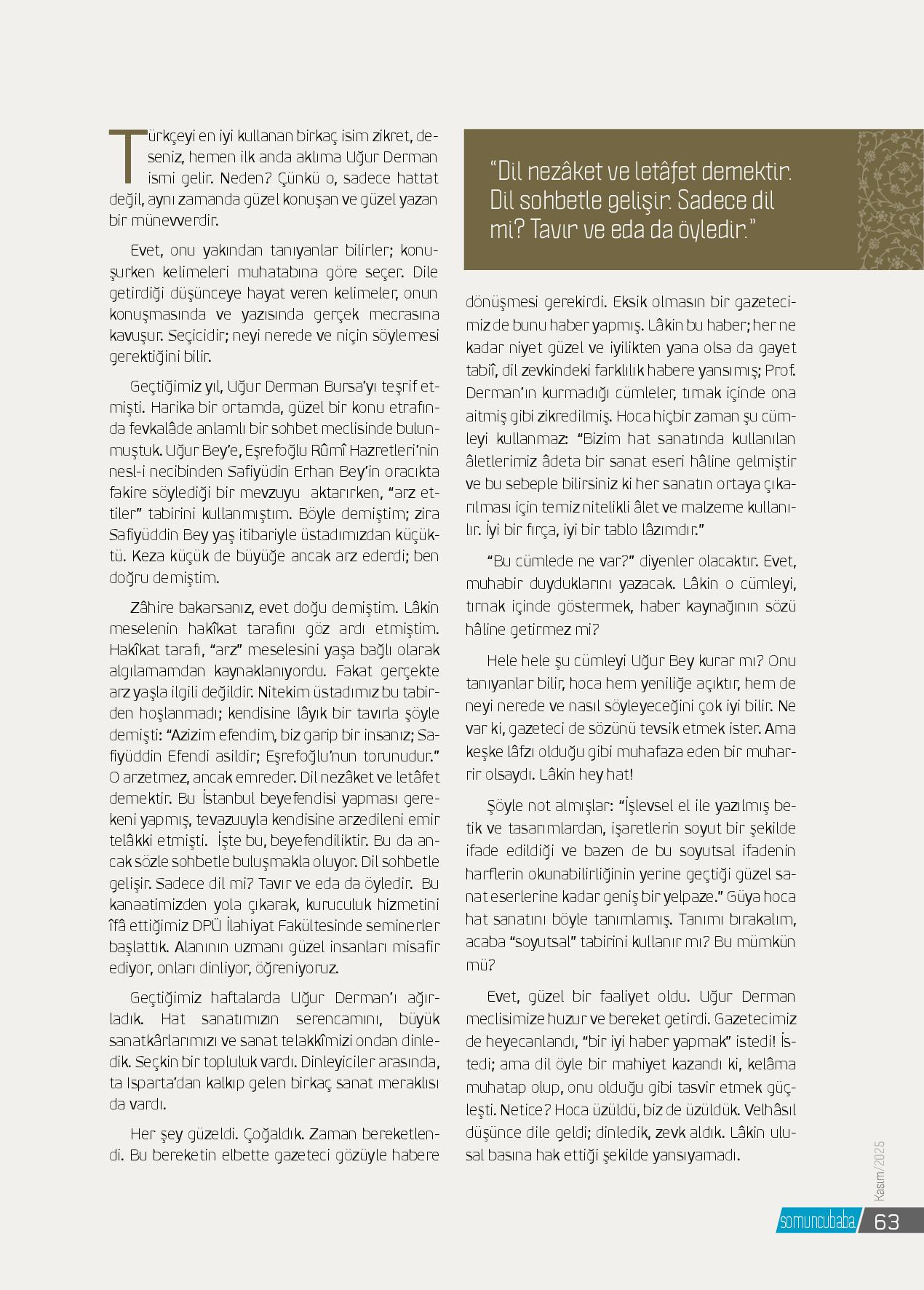 Türkçeyi en iyi kullanan birkaç isim zikret, deseniz, hemen ilk anda aklıma Uğur Derman ismi gelir. Neden? Çünkü o, sadece hattat değil, aynı zamanda güzel konuşan ve güzel yazan bir münevverdir. Evet, onu yakından tanıyanlar bilirler; konuşurken kelimeleri muhatabına göre s...
