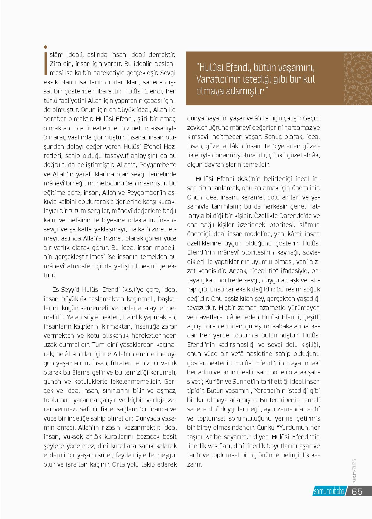 İslâm ideali, aslında insan ideali demektir. Zira din, insan için vardır. Bu idealin beslenmesi ise kalbin hareketiyle gerçekleşir. Sevgi eksik olan insanların dindarlıkları, sadece dışsal bir gösteriden ibarettir. Hulûsi Efendi, her türlü faaliyetini Allah içi...