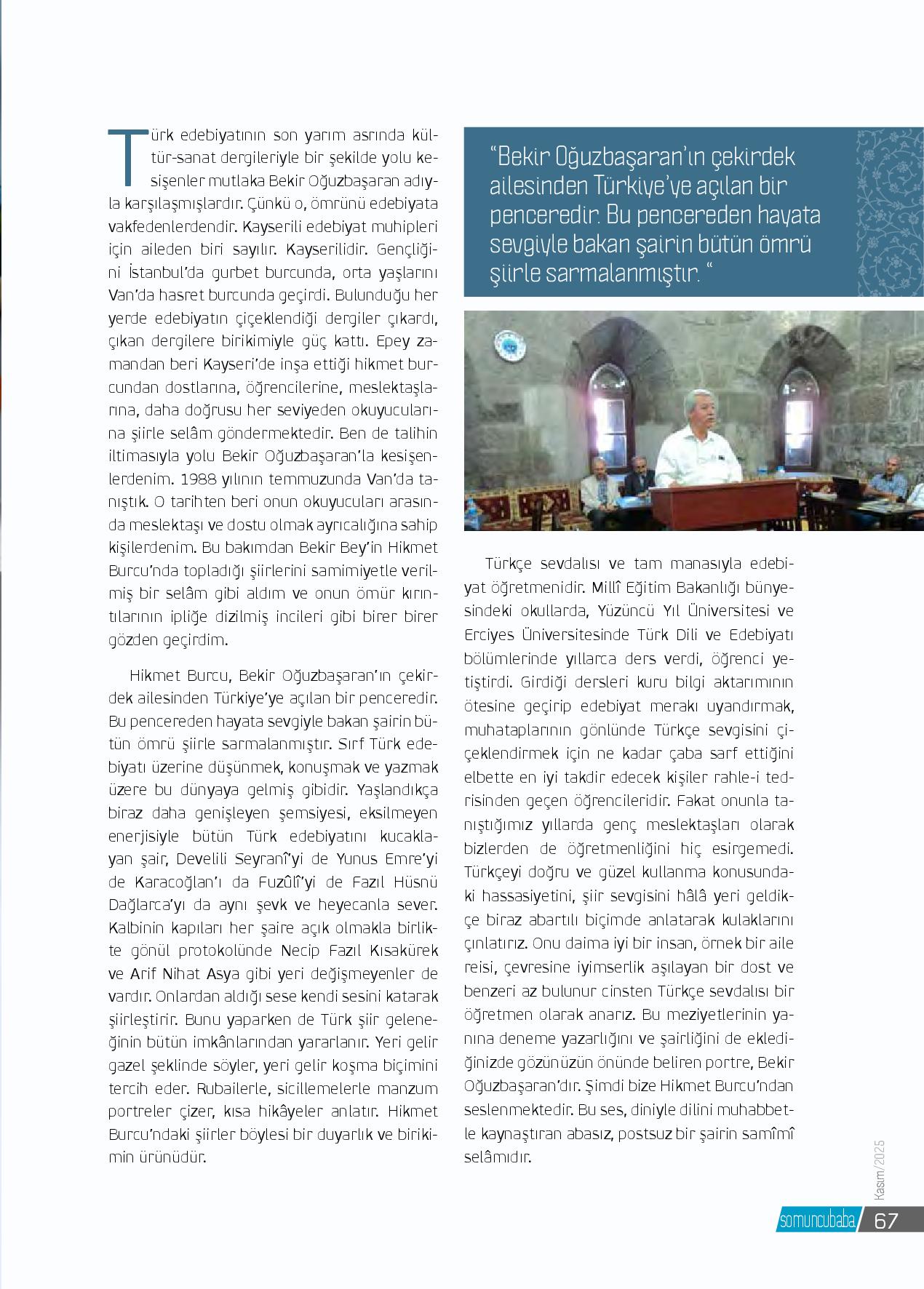 Türk edebiyatının son yarım asrında kültür-sanat dergileriyle bir şekilde yolu kesişenler mutlaka Bekir Oğuzbaşaran adıyla karşılaşmışlardır. Çünkü o, ömrünü edebiyata vakfedenlerdendir. Kayserili edebiyat muhipleri için aileden biri sayılır. Kayserilidir. Gençliğini İs...