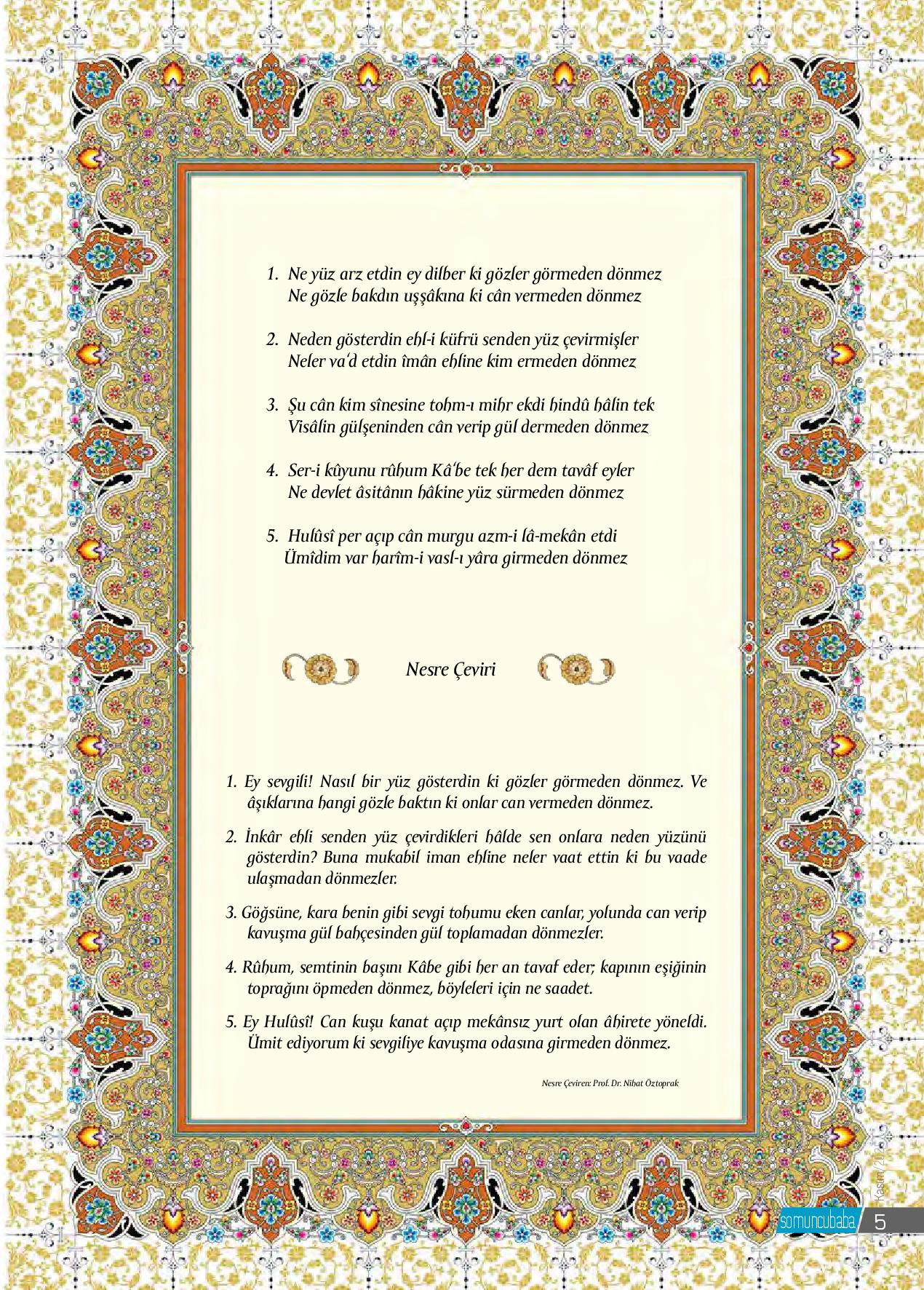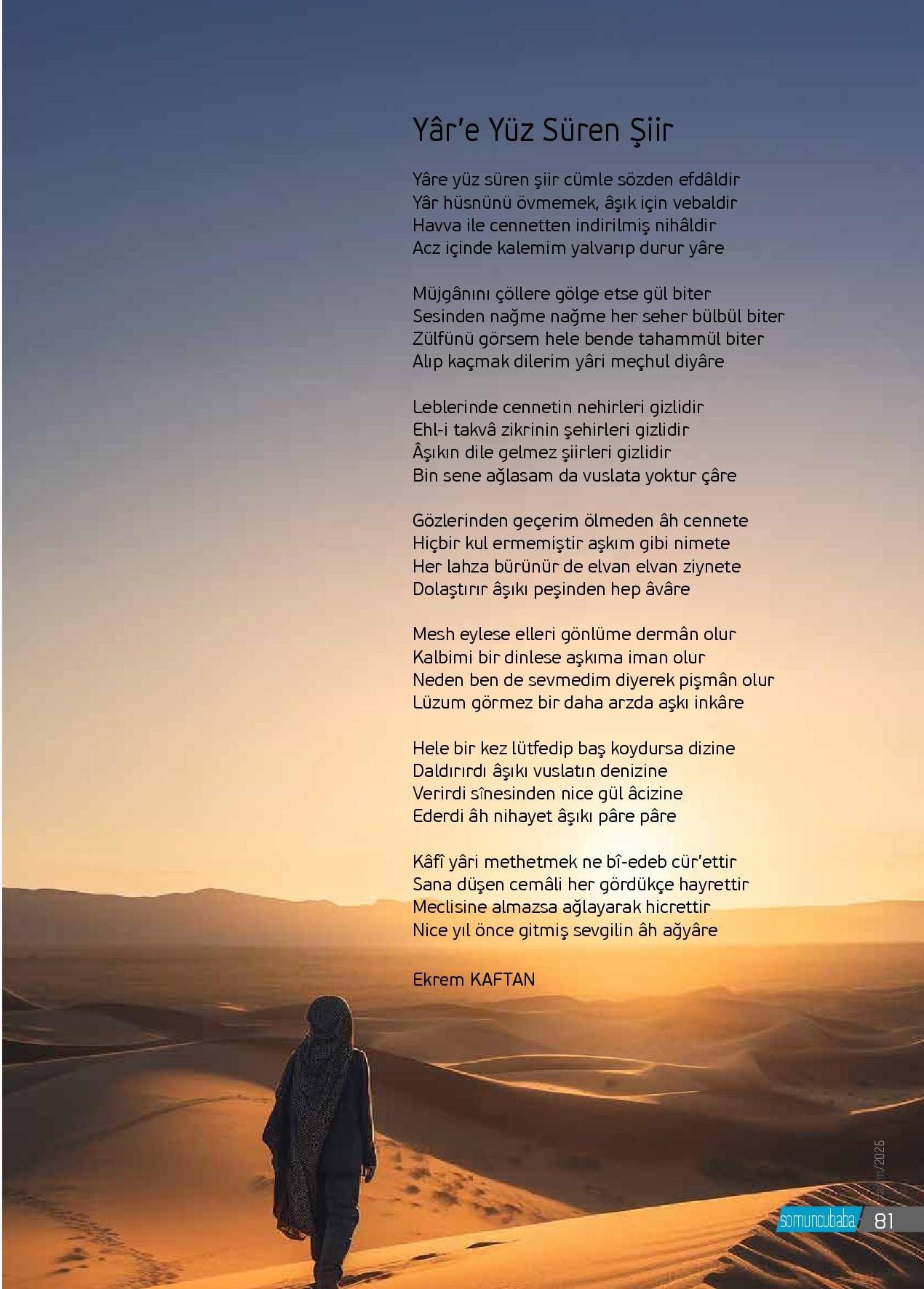 Yâre yüz süren şiir cümle sözden efdâldirYâr hüsnünü övmemek, âşık için vebaldirHavva ile cennetten indirilmiş nihâldirAcz içinde kalemim yalvarıp durur yâreMüjgânını çöllere gölge etse gül biterSesinden nağme nağme her seher bülbül biterZülfünü görsem hele bende tahammül biterAl...