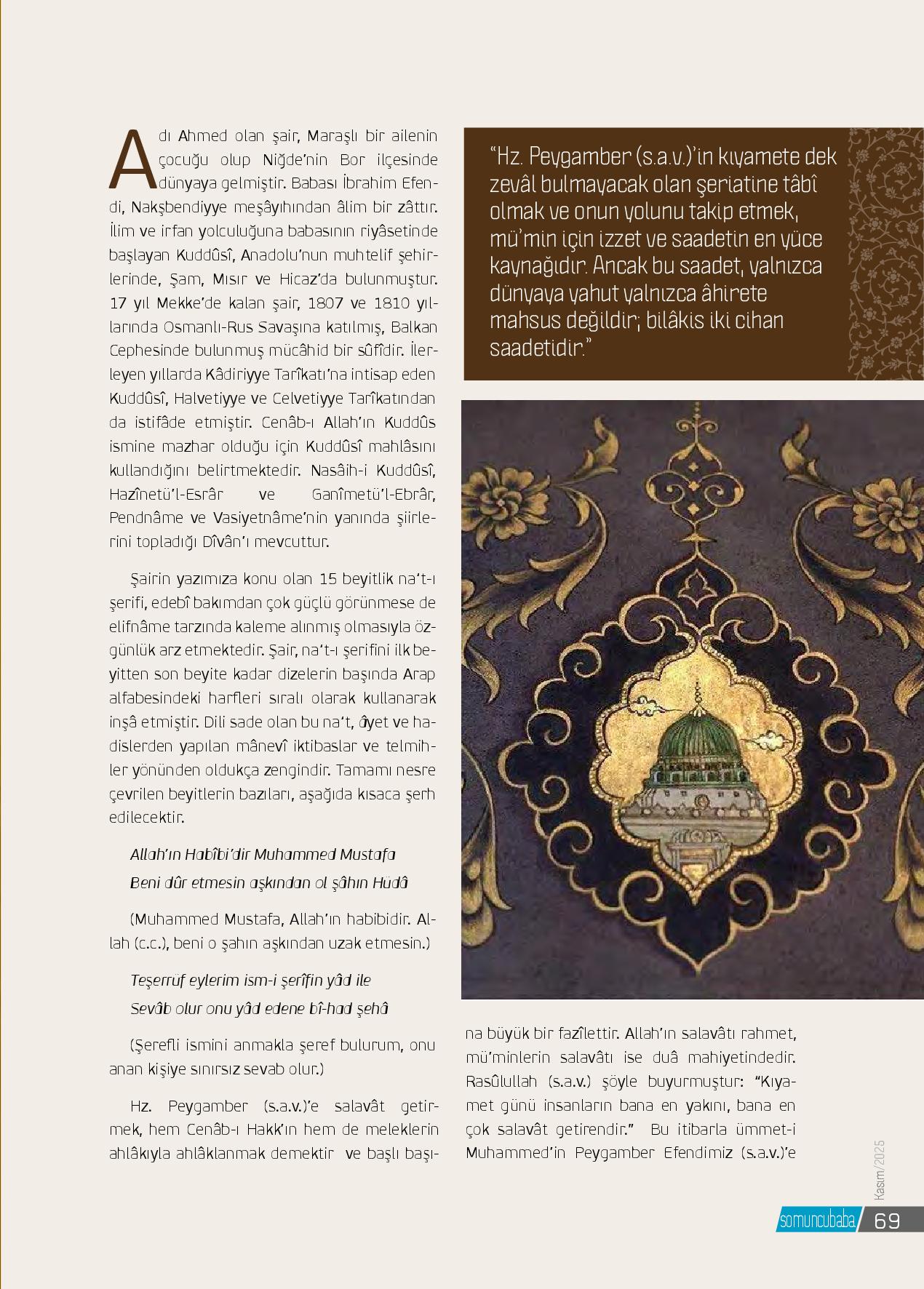 Adı Ahmed olan şair, Maraşlı bir ailenin çocuğu olup Niğde’nin Bor ilçesinde dünyaya gelmiştir. Babası İbrahim Efendi, Nakşbendiyye meşâyıhından âlim bir zâttır. İlim ve irfan yolculuğuna babasının riyâsetinde başlayan Kuddûsî, Anadolu’nun muhtelif şehirler...