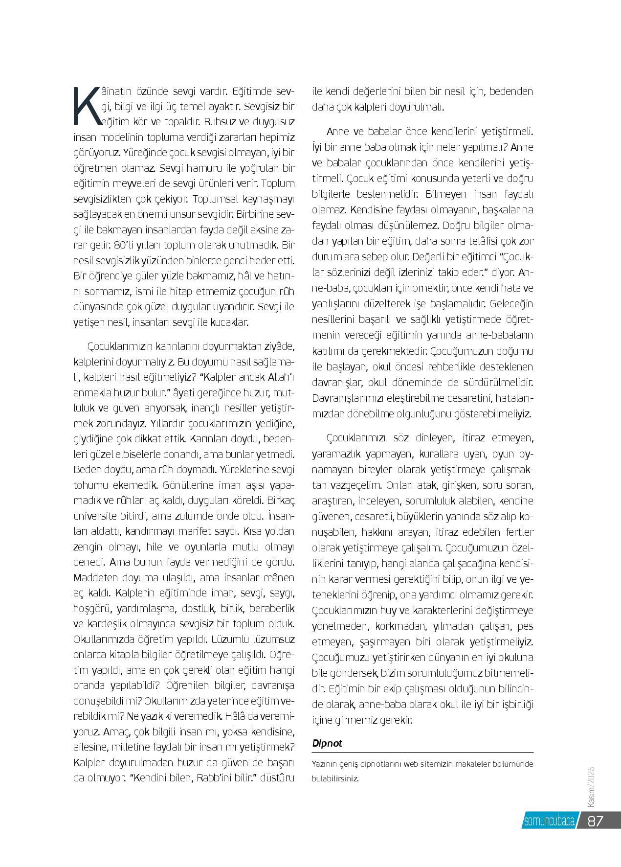 Kâinatın özünde sevgi vardır. Eğitimde sevgi, bilgi ve ilgi üç temel ayaktır. Sevgisiz bir eğitim kör ve topaldır. Ruhsuz ve duygusuz insan modelinin topluma verdiği zararları hepimiz görüyoruz. Yüreğinde çocuk sevgisi olmayan, iyi bir öğretmen olamaz. Sevgi hamuru...