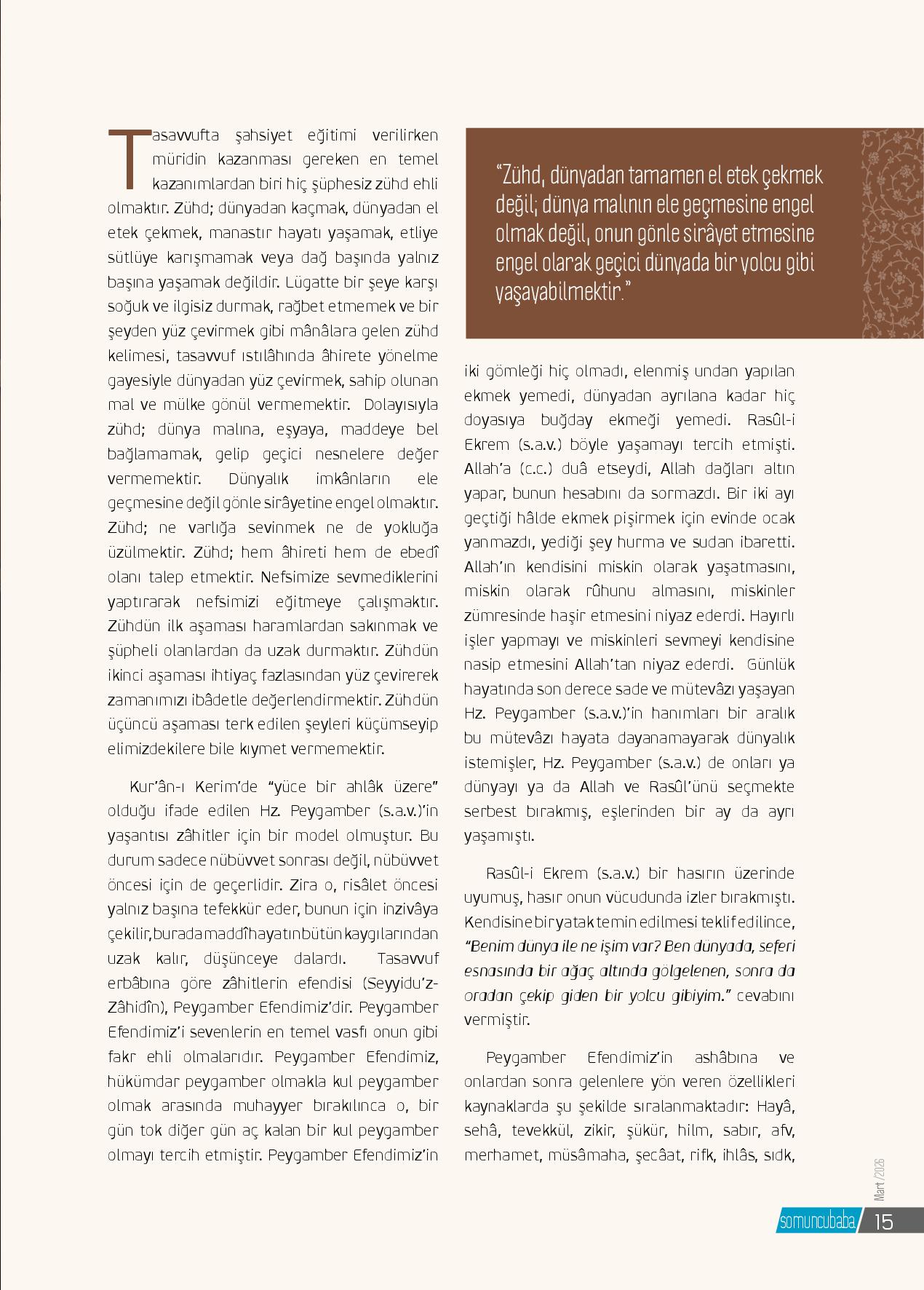 Tasavvufta şahsiyet eğitimi verilirken müridin kazanması gereken en temel kazanımlardan biri hiç şüphesiz zühd ehli olmaktır. Zühd; dünyadan kaçmak, dünyadan el etek çekmek, manastır hayatı yaşamak, etliye sütlüye karışmamak veya dağ başında yalnız başına ...