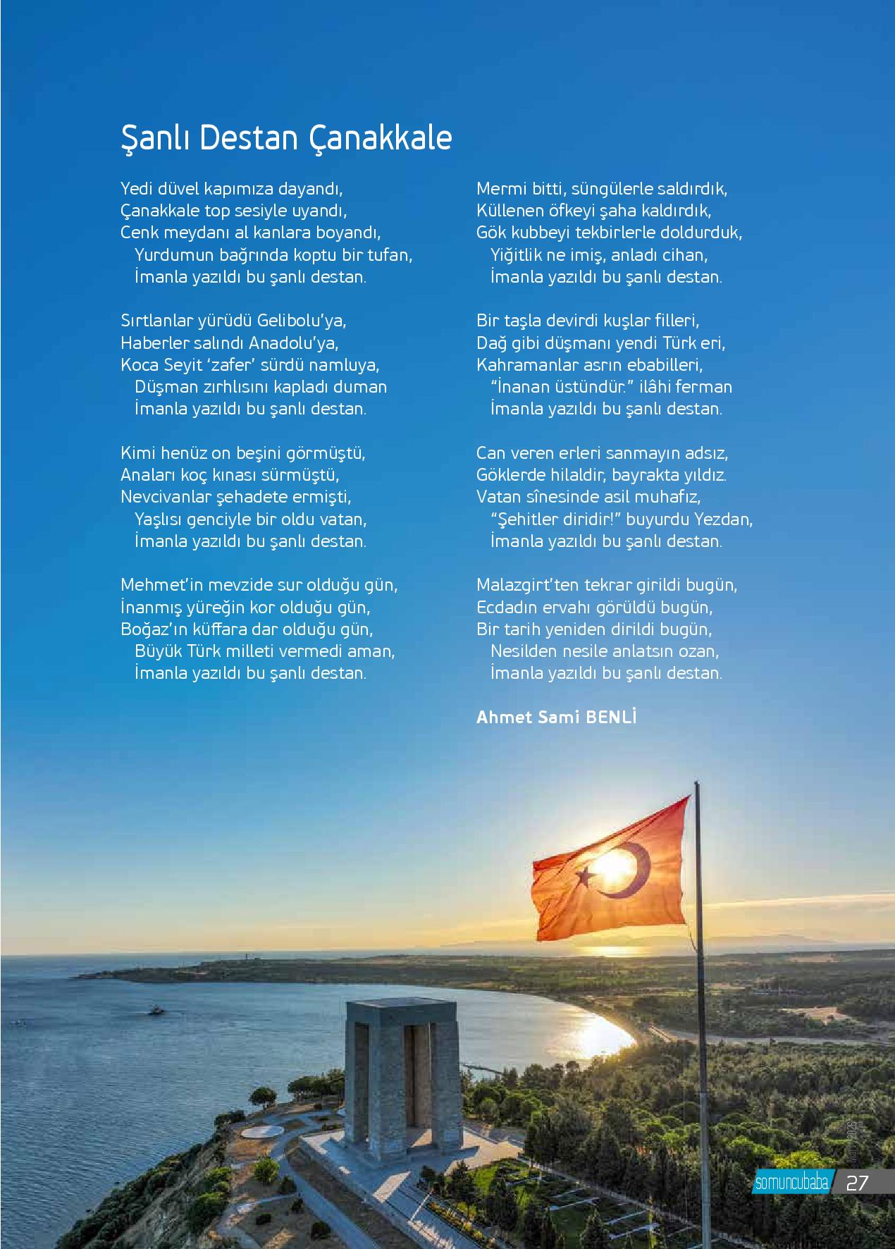 Yedi düvel kapımıza dayandı,Çanakkale top sesiyle uyandı,Cenk meydanı al kanlara boyandı, Yurdumun bağrında koptu bir tufan, İmanla yazıldı bu şanlı destan.Sırtlanlar yürüdü Gelibolu’ya,Haberler salındı Anadolu’ya,Koca Seyit ‘zafer’ sürdü namluya, ...
