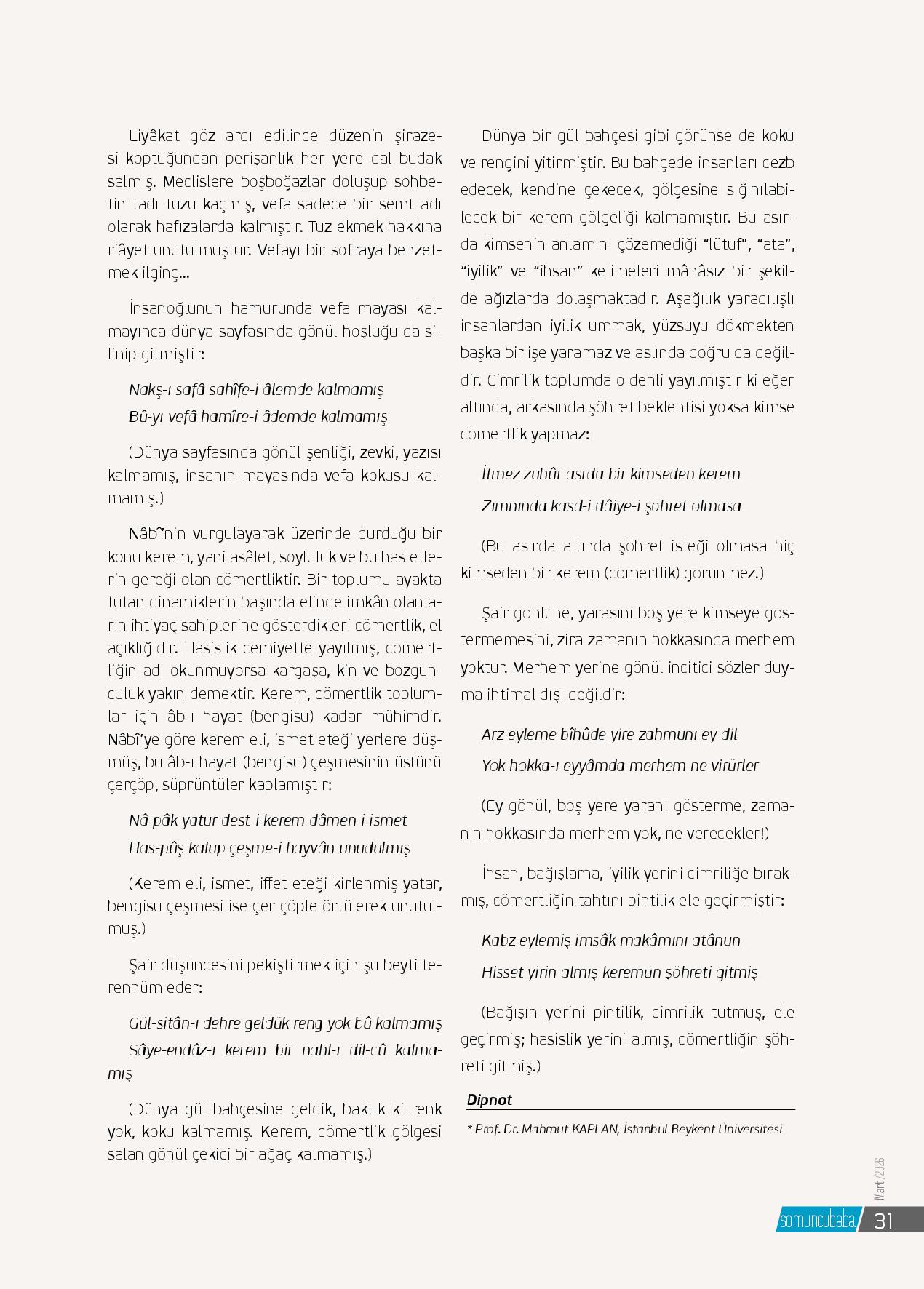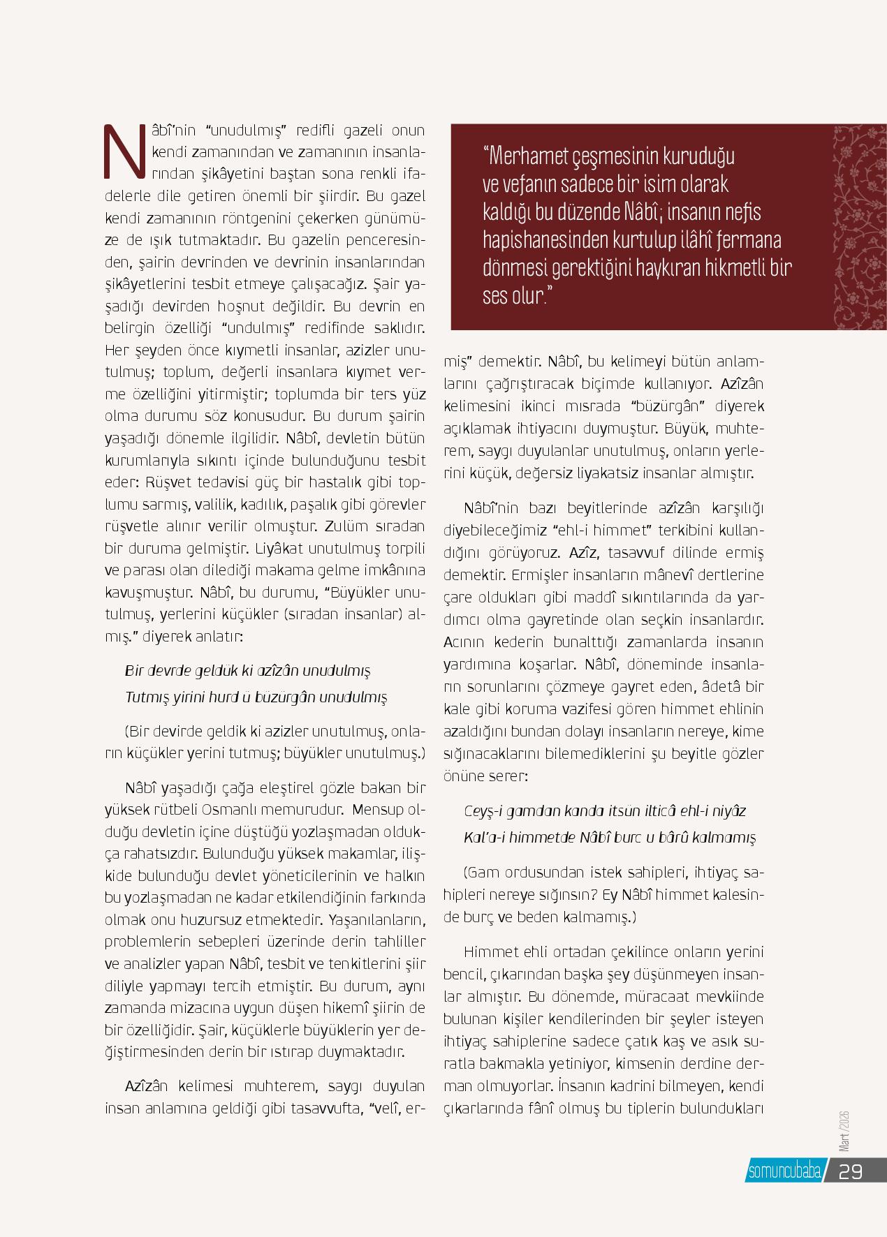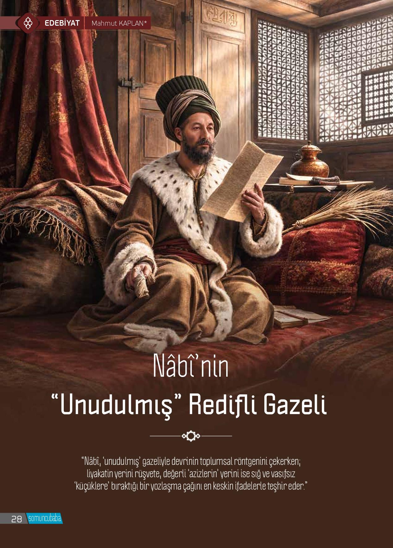 Nâbî'nin “unudulmış” redifli gazeli onun kendi zamanından ve zamanının insanlarından şikâyetini baştan sona renkli ifadelerle dile getiren önemli bir şiirdir. Bu gazel kendi zamanının röntgenini çekerken günümüze de ışık tutmaktadır. Bu gazelin penceresinden, şair...
