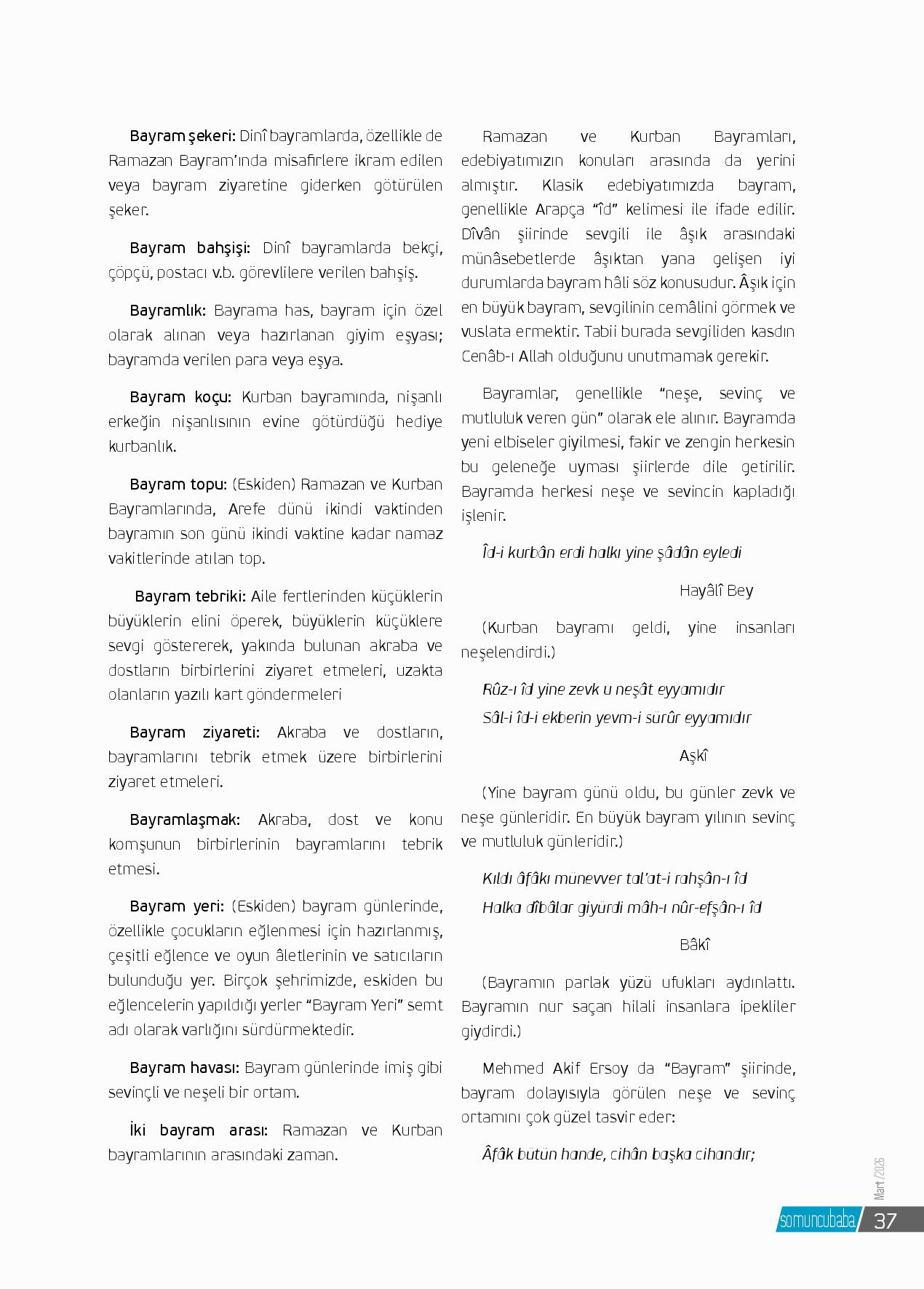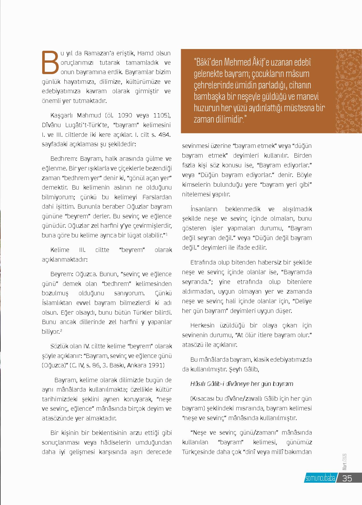 Bu yıl da Ramazan’a eriştik, Hamd olsun oruçlarımızı tutarak tamamladık ve onun bayramına erdik. Bayramlar bizim günlük hayatımıza, dilimize, kültürümüze ve edebiyatımıza kavram olarak girmiştir ve önemli yer tutmaktadır.Kaşgarlı Mahmud (öl. 1090 veya 1105), Dîvânu Lugâti’t-Türk’te, “ba...