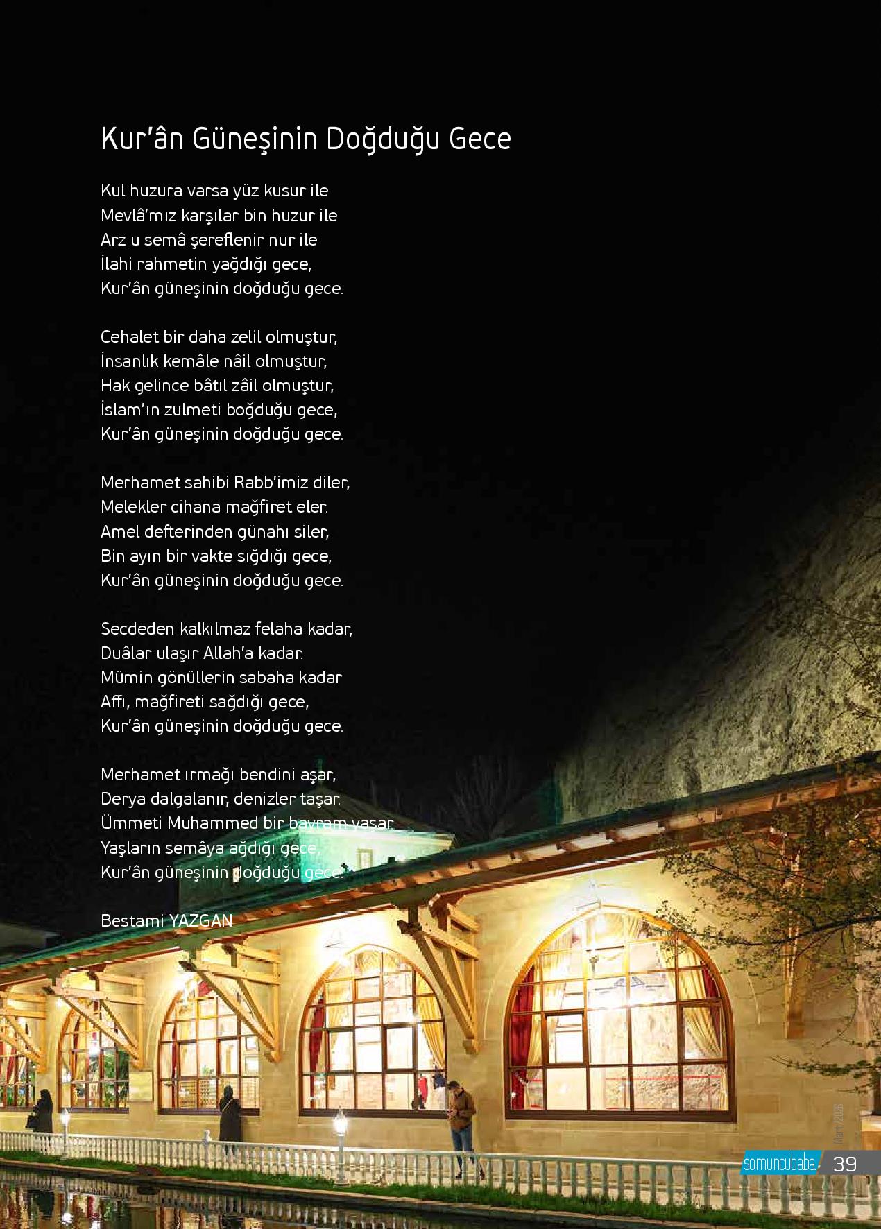 Kul huzura varsa yüz kusur ileMevlâ’mız karşılar bin huzur ileArz u semâ şereflenir nur ileİlahi rahmetin yağdığı gece,Kur’ân güneşinin doğduğu gece.Cehalet bir daha zelil olmuştur,İnsanlık kemâle nâil olmuştur,Hak gelince bâtıl zâil olmuştur,İslam’ın zulmeti boğduğu gec...