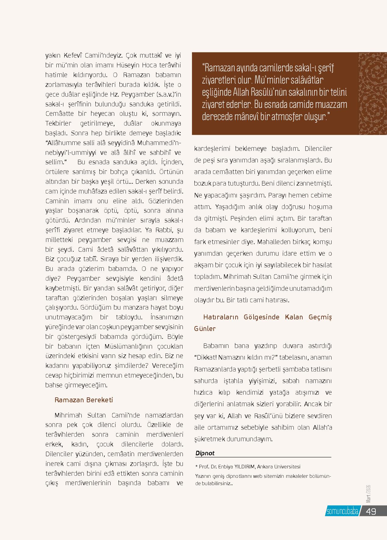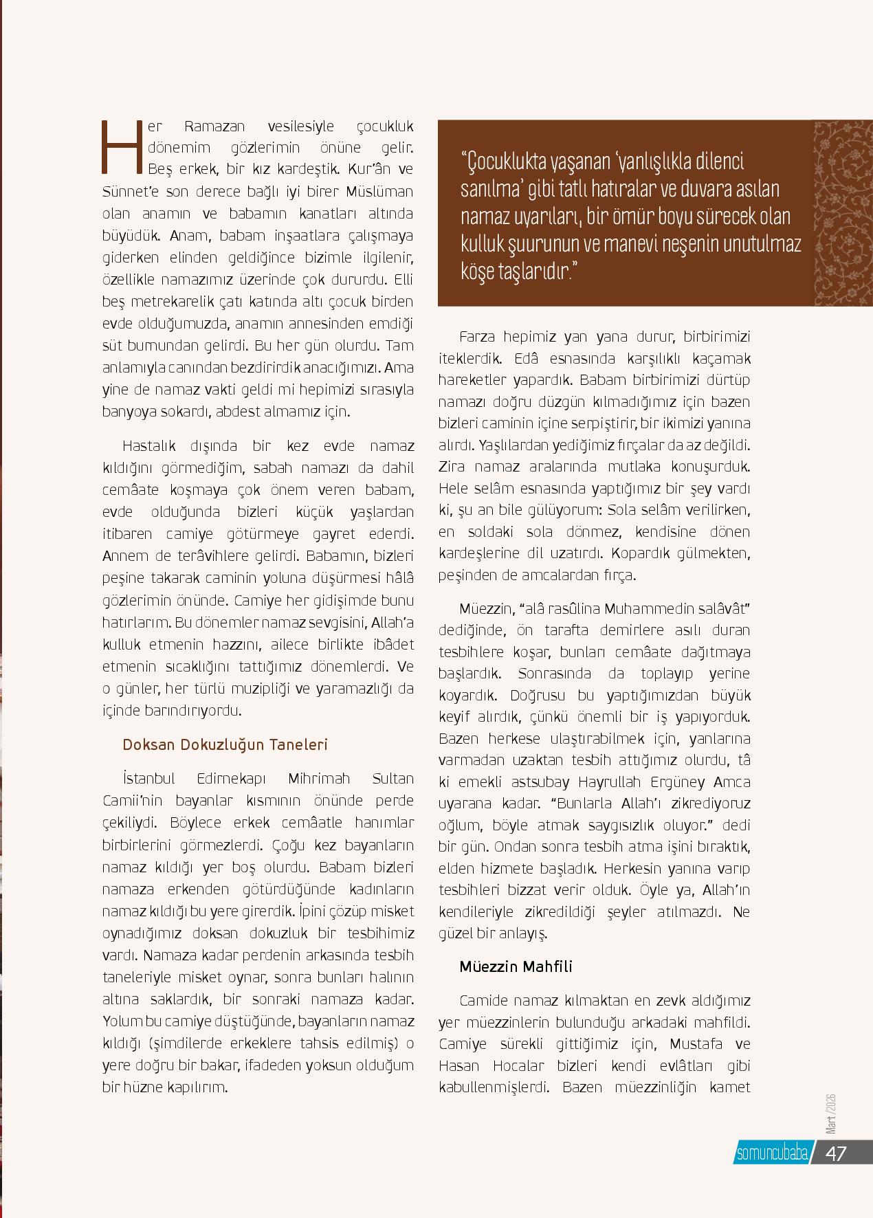 Her Ramazan vesilesiyle çocukluk dönemim gözlerimin önüne gelir. Beş erkek, bir kız kardeştik. Kur’ân ve sünnete son derece bağlı iyi birer Müslüman olan anamın ve babamın kanatları altında büyüdük. Anam, babam inşaatlara çalışmaya giderken elinden geldiğince bizimle ilgilenir, öz...