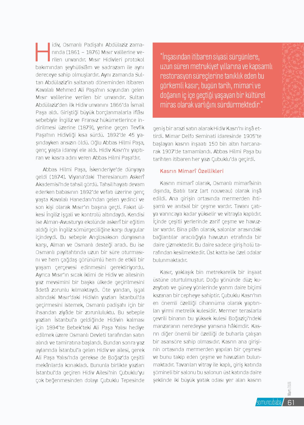 Hidiv Kasrı Tarihçesi ve Mimarî Özellikleri