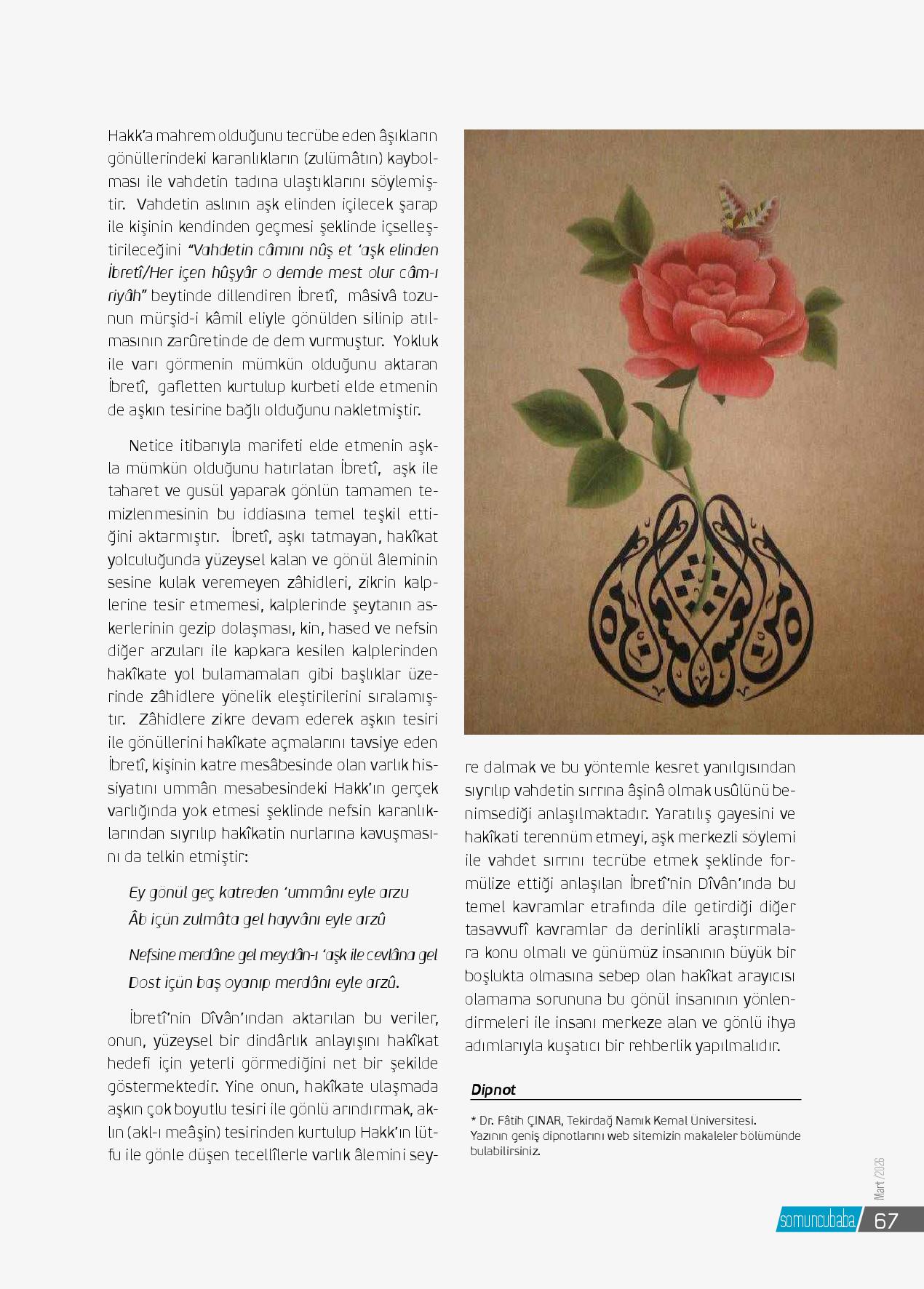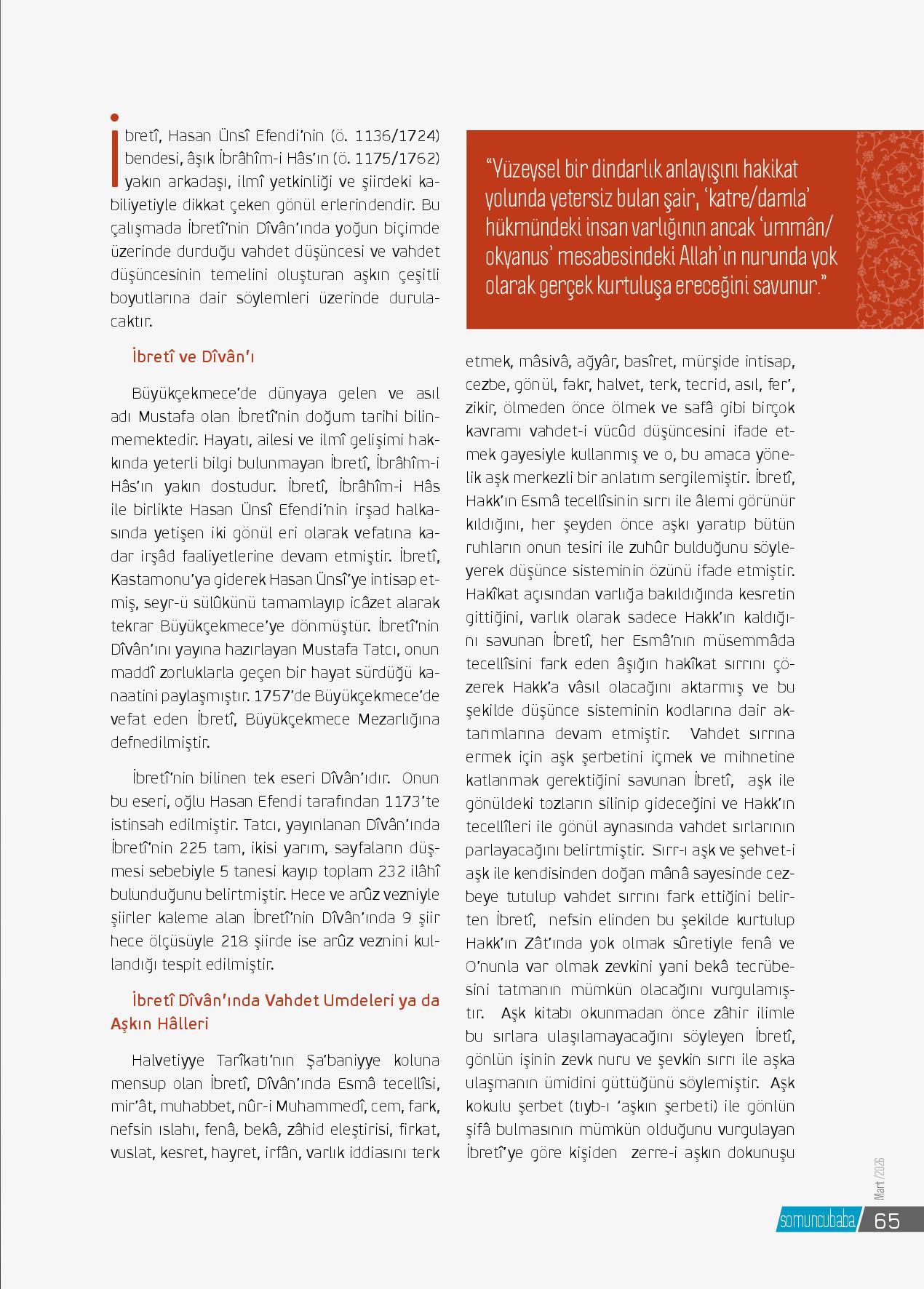 İbretî, Hasan Ünsî Efendi’nin (ö. 1136/1724) bendesi, âşık İbrâhîm-i Hâs’ın (ö. 1175/1762) yakın arkadaşı, ilmî yetkinliği ve şiirdeki kabiliyetiyle dikkat çeken gönül erlerindendir. Bu çalışmada İbretî’nin Dîvân’ında yoğun biçimde üzerinde durduğu vahdet düşüncesi ve ...