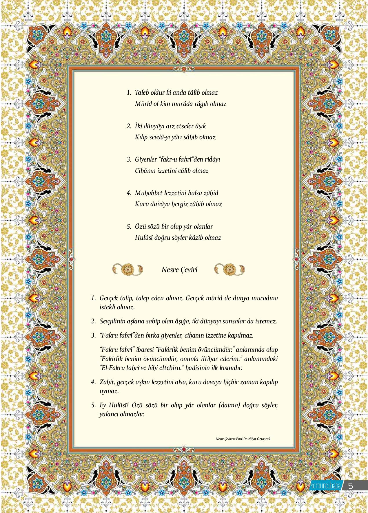 1. Taleb oldur ki anda tâlib olmaz Mürîd ol kim murâda râgıb olmaz2. İki dünyâyı arz etseler âşık Kılıp sevdâ-yı yârı sâhib olmaz3. Giyenler “fakr-u fahrî”den ridâyı Cihânın...