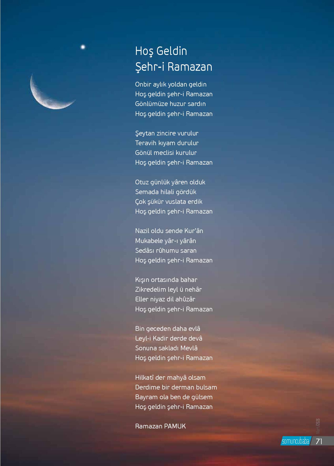 Onbir aylık yoldan geldinHoş geldin şehr-i RamazanGönlümüze huzur sardınHoş geldin şehr-i RamazanŞeytan zincire vurulurTeravih kıyam durulurGönül meclisi kurulurHoş geldin şehr-i RamazanOtuz günlük yâren oldukSemada hilali gördükÇok şükür vuslata erdikHoş geldin şehr-i Ramaz...