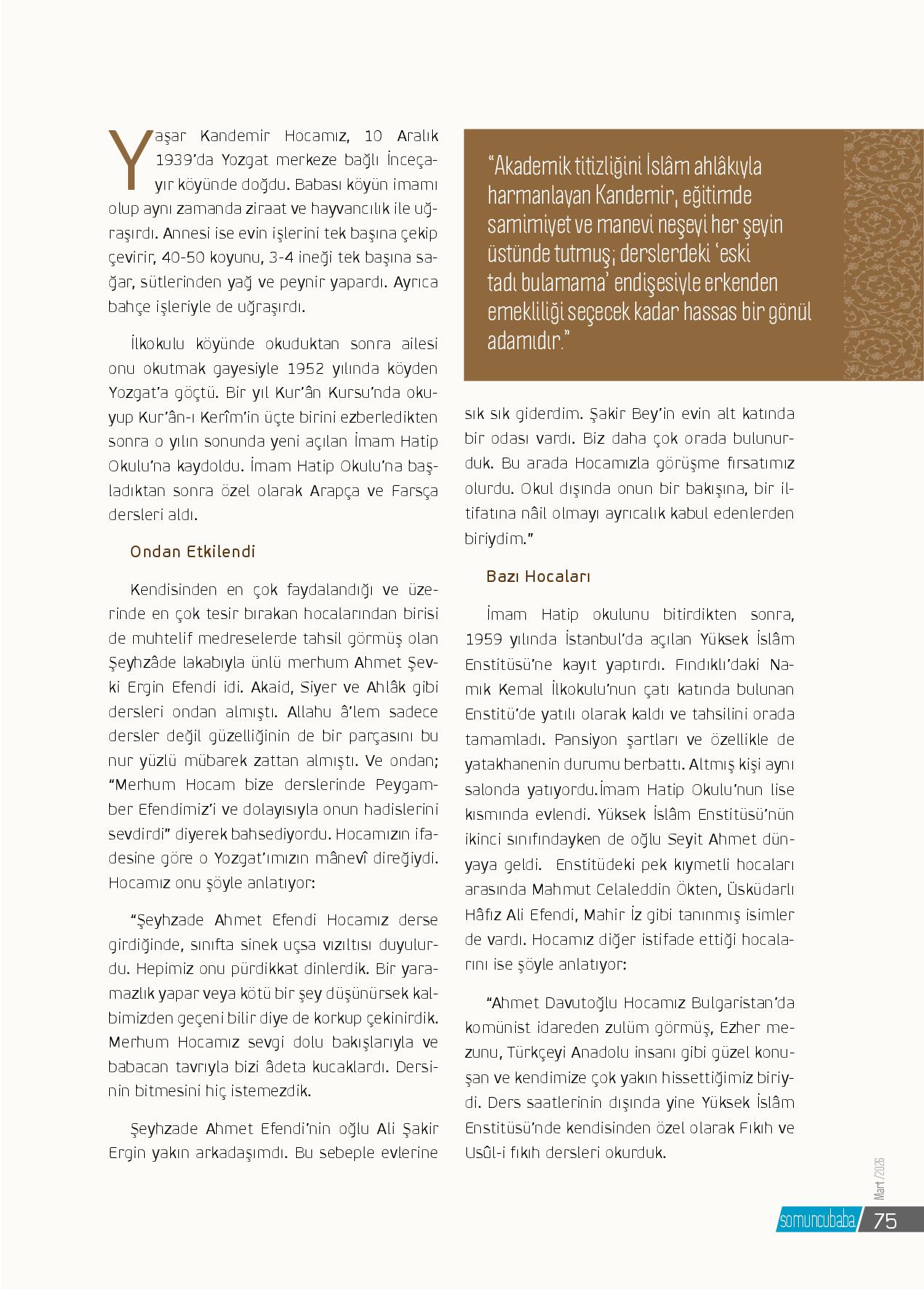 Yaşar Kandemir Hoca’mız, 10 Aralık 1939’da Yozgat merkeze bağlı İnceçayır köyünde doğdu. Babası köyün imamı olup aynı zamanda ziraat ve hayvancılık ile uğraşırdı. Annesi ise evin işlerini tek başına çekip çevirir, 40-50 koyunu, 3-4 ineği tek başına sağar, sütlerinden yağ ve peynir yap...