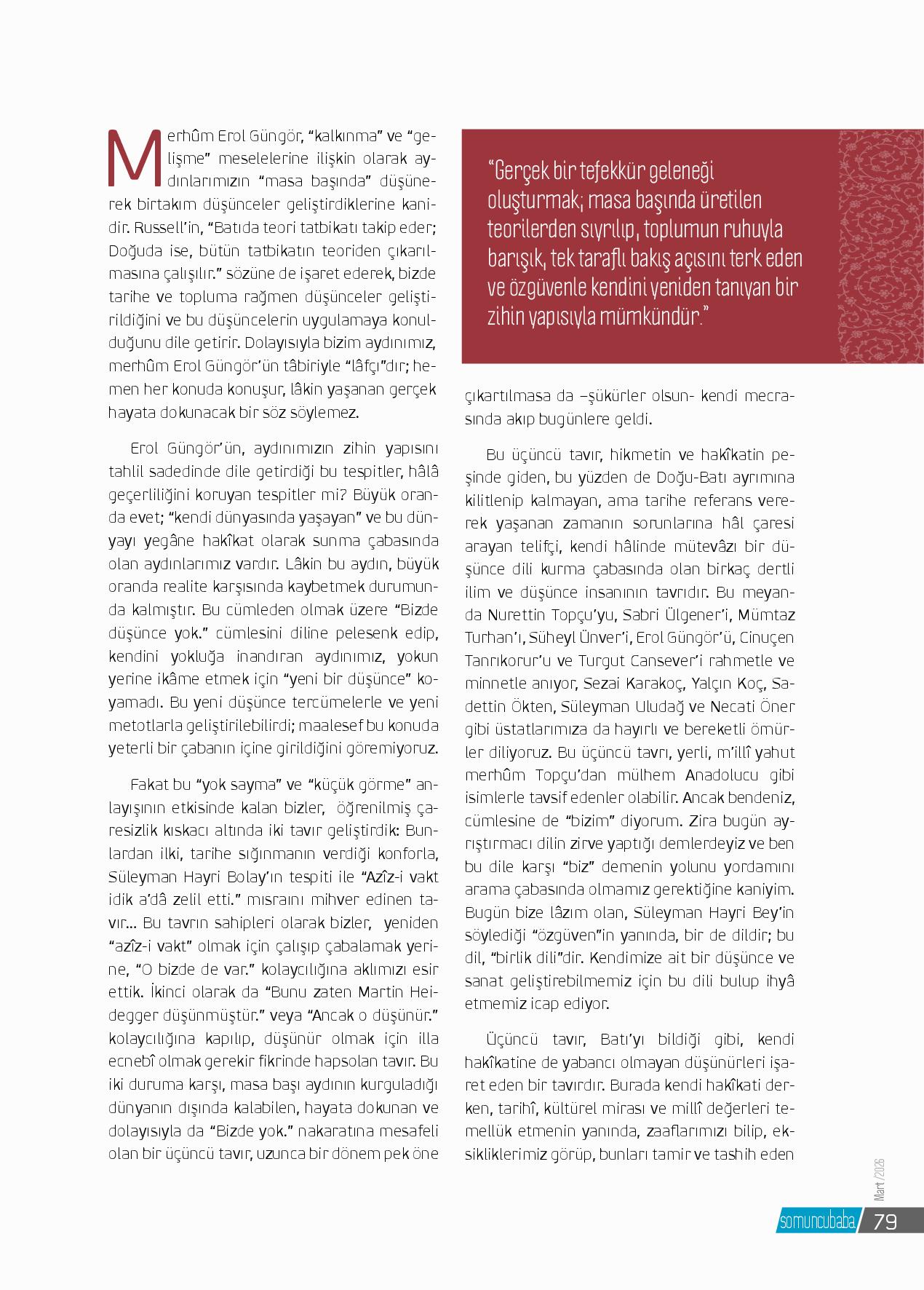 Merhûm Erol Güngör, “kalkınma” ve “gelişme” meselelerine ilişkin olarak aydınlarımızın “masa başında” düşünerek birtakım düşünceler geliştirdiklerine kanidir. Russell’in, “Batıda teori tatbikatı takip eder; Doğuda ise, bütün tatbikatın teoriden çıkarılmasına çalışı...