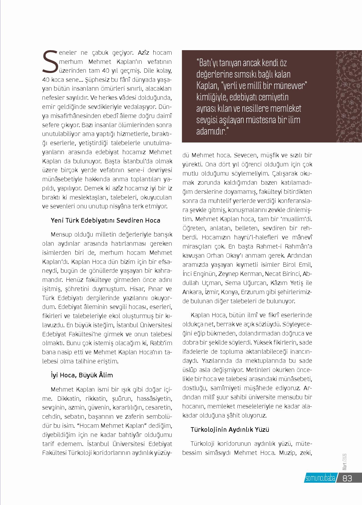Seneler ne çabuk geçiyor. Azîz hocam merhum Mehmet Kaplan’ın vefatının üzerinden tam 40 yıl geçmiş. Dile kolay, 40 koca sene… Şüphesiz bu fânî dünyada yaşayan bütün insanların ömürleri sınırlı, alacakları nefesler sayılıdır. Ve herkes vâdesi dolduğunda, ...