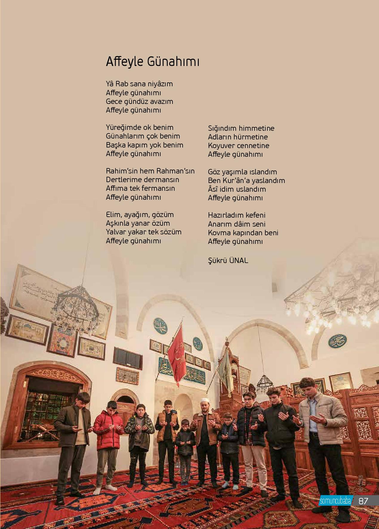 Yâ Rab sana niyâzımAffeyle günahımıGece gündüz avazımAffeyle günahımıYüreğimde ok benimGünahlarım çok benimBaşka kapım yok benimAffeyle günahımıRahim’sin hem Rahman’sınDertlerime dermansınAffıma tek fermansınAffeyle günahımıElim, ayağım, gözümAşkınla yanar özümYalvar yakar tek sözümA...