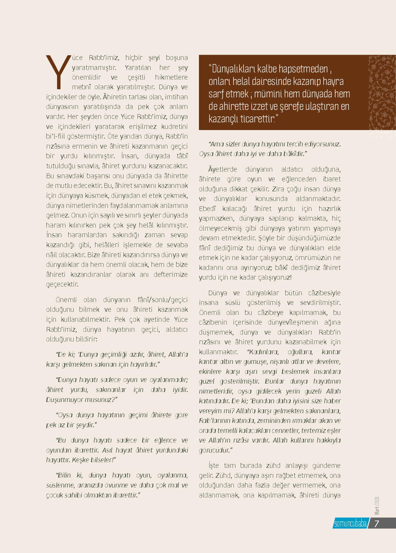 Yüce Rabb’imiz, hiçbir şeyi boşuna yaratmamıştır. Yaratılan her şey önemlidir ve çeşitli hikmetlere mebnî olarak yaratılmıştır. Dünya ve içindekiler de öyle. Âhiretin tarlası olan, imtihan dünyasının yaratılışında da pek çok anlam vardır. Her şeyden önce Y...