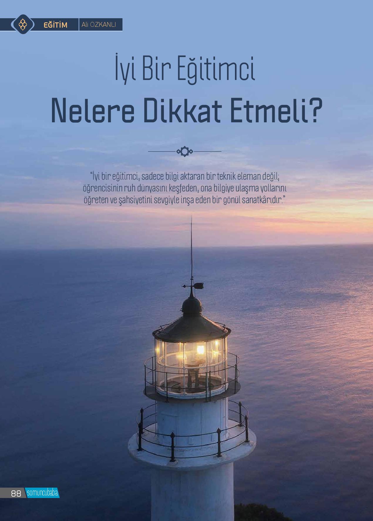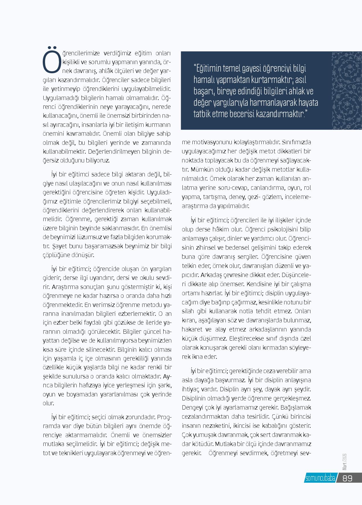 Öğrencilerimize verdiğimiz eğitim onları kişilikli ve sorumlu yapmanın yanında, örnek davranış, ahlâk ölçüleri ve değer yargıları kazandırmalıdır. Öğrenciler sadece bilgileri ile yetinmeyip öğrendiklerini uygulayabilmelidir. Uygulamadığı bilgilerin hamalı olmama...