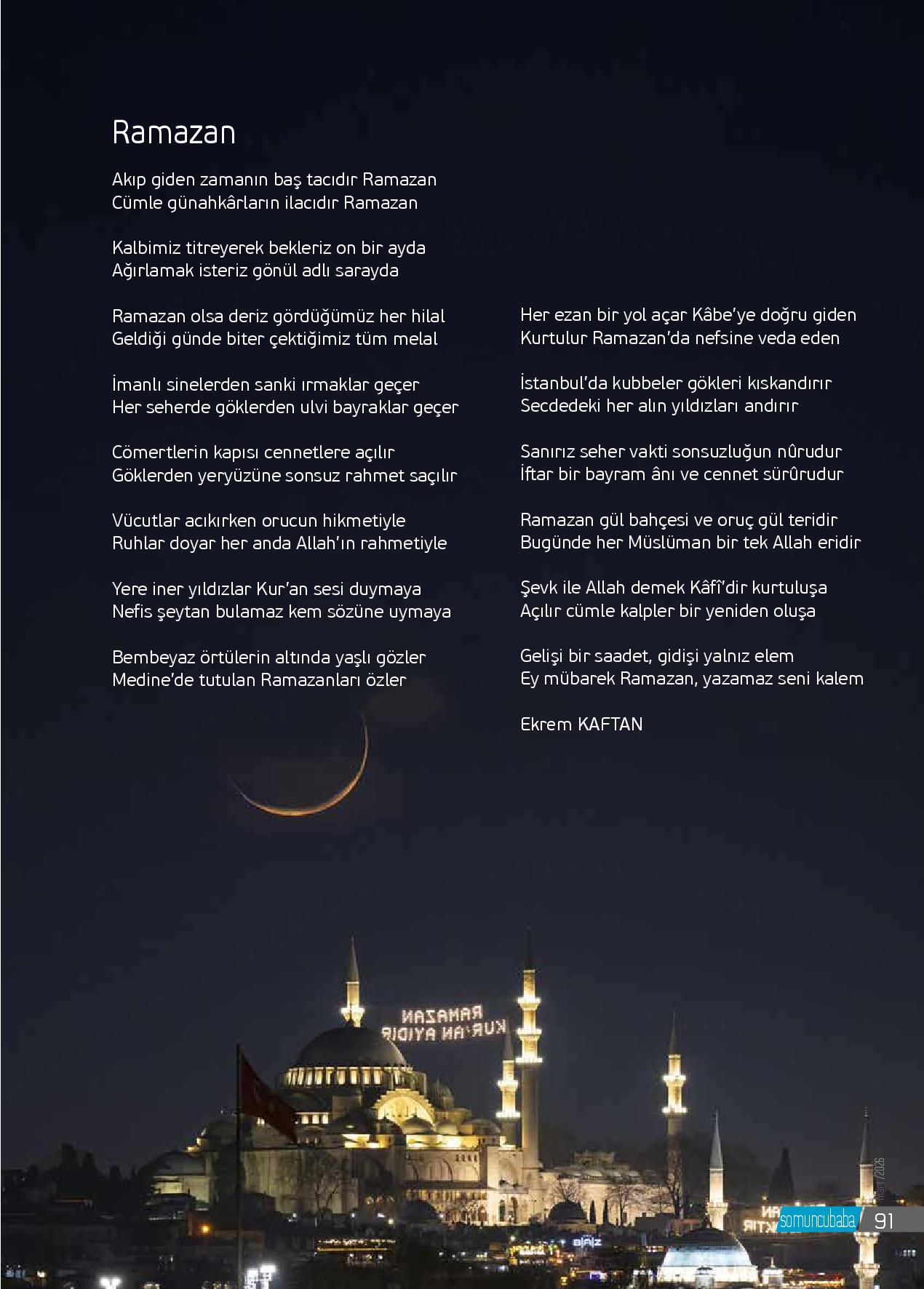 Akıp giden zamanın baş tacıdır RamazanCümle günahkârların ilacıdır RamazanKalbimiz titreyerek bekleriz on bir aydaAğırlamak isteriz gönül adlı saraydaRamazan olsa deriz gördüğümüz her hilalGeldiği günde biter çektiğimiz tüm melalİmanlı sinelerden sanki ırmaklar geçerHer seherde göklerden ulvi...
